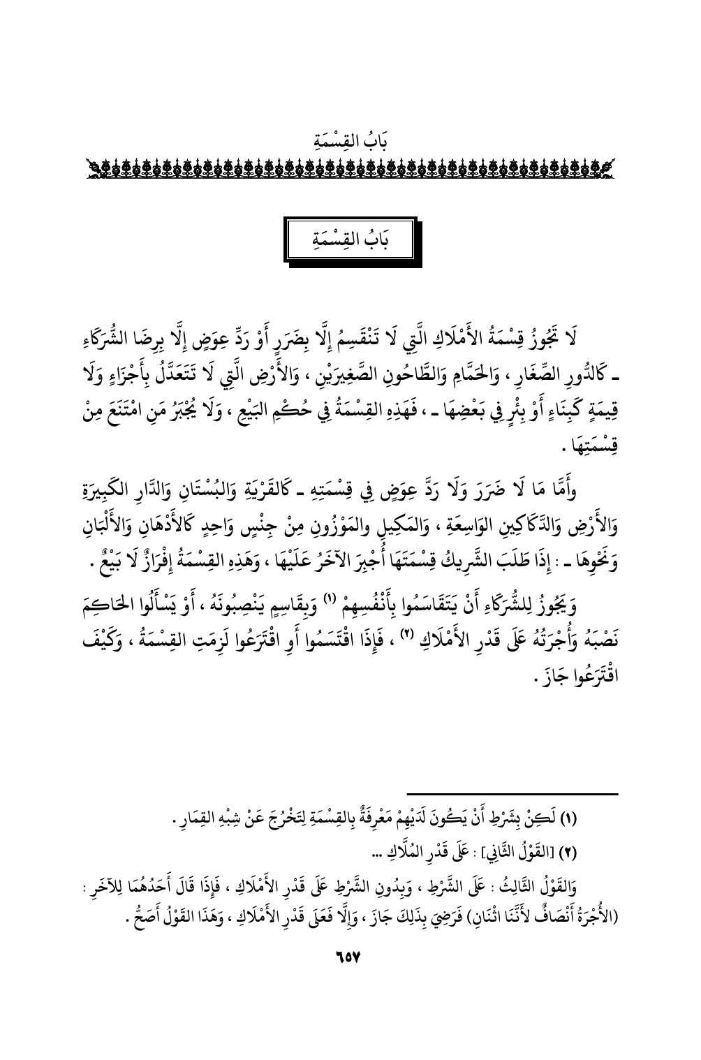 لا تجوز قسمة الأملاك التي لا تنقسم إلا بضررٍ أو رد عوضٍ إلا برضا الشركاء - كالدور الصغار، والحمام والطاحون الصغيرين، والأرض التي لا تتعدل بأجزاءٍ ولا قيمةٍ كبناءٍ أو بئرٍ في بعضها -، فهذه القسمة في حكم البيع، ولا يجبر من امتنع من قسمتها.