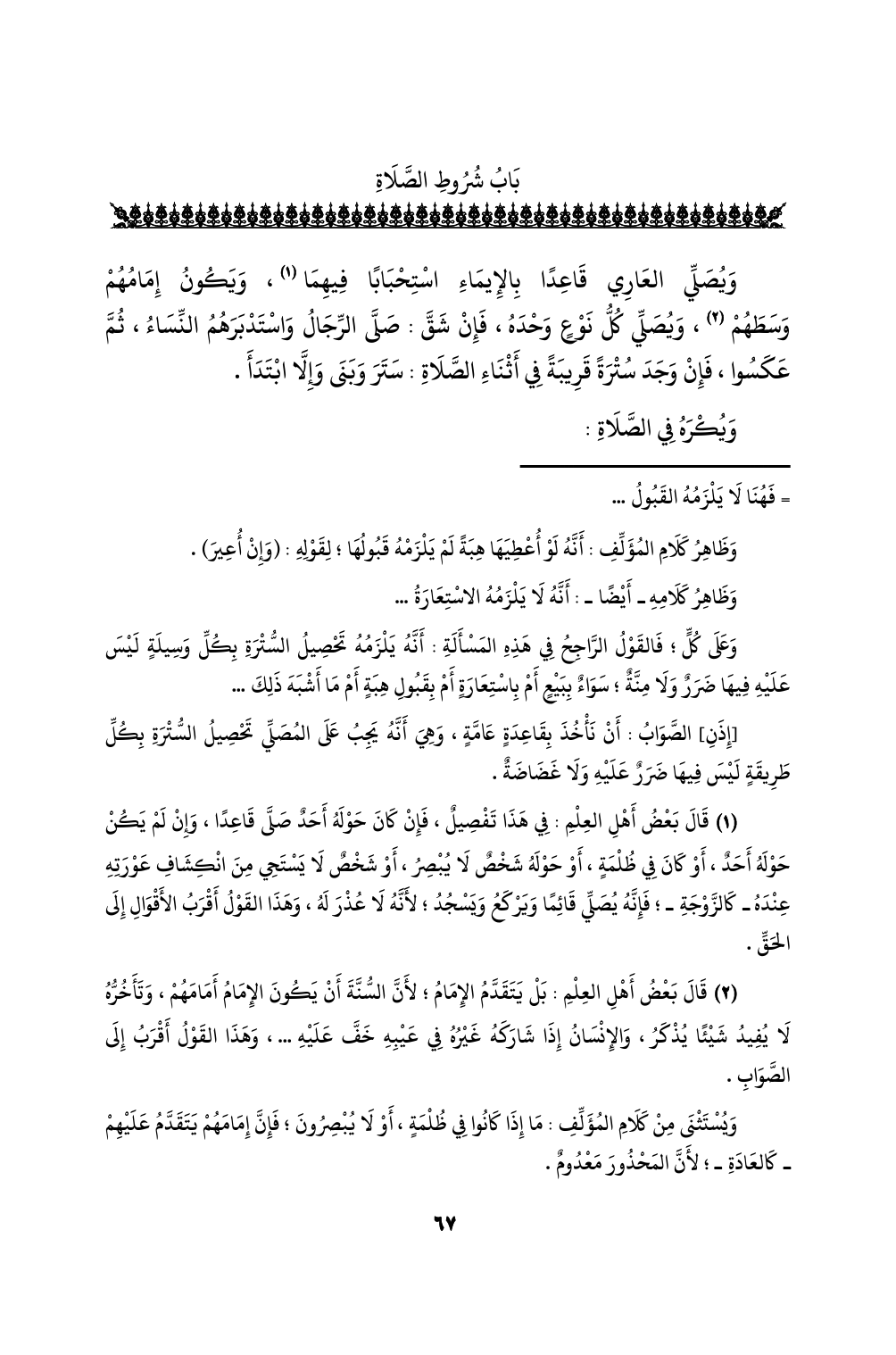 (¬1) قال بعض أهل العلم: في هذا تفصيلٌ، فإن كان حوله أحدٌ صلى قاعدًا، وإن لم يكن حوله أحدٌ، أو كان في ظلمةٍ، أو حوله شخصٌ لا يبصر، أو شخصٌ لا يستحي من انكشاف عورته عنده - كالزوجة -؛ فإنه يصلي قائمًا ويركع ويسجد؛ لأنه لا عذر له، وهذا القول أقرب الأقوال إلى الحق.