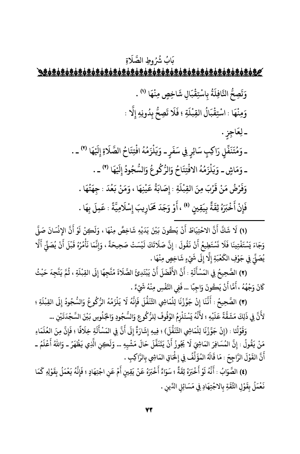 (¬2) الصحيح في المسألة: أن الأفضل أن يبتدئ الصلاة متجهًا إلى القبلة، ثم يتجه حيث كان وجهه، أما أن يكون واجبًا ... ففي النفس منه شيءٌ.