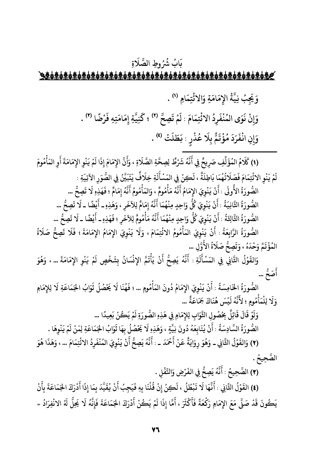 (¬1) كلام المؤلف صريحٌ في أنه شرطٌ لصحة الصلاة، وأن الإمام إذا لم ينو الإمامة أو المأموم لم ينو الائتمام فصلاتهما باطلةٌ، لكن في المسألة خلافٌ يتبين في الصور الآتية: