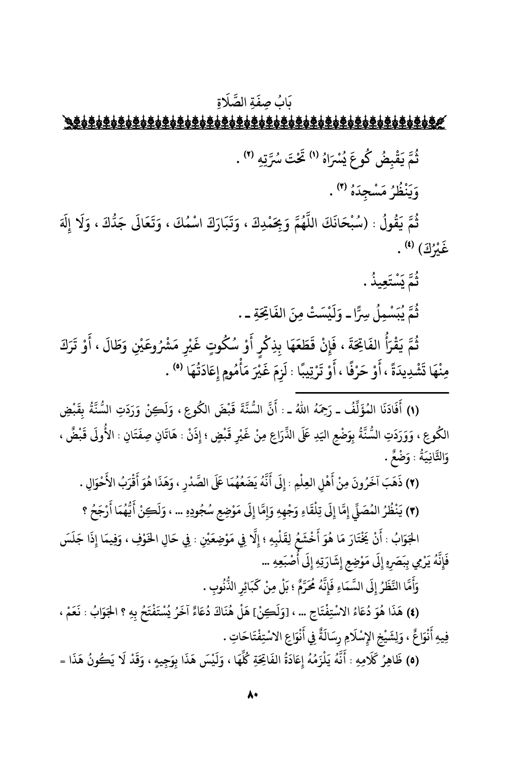 (¬1) أفادنا المؤلف - رحمه الله -: أن السنة قبض الكوع، ولكن وردت السنة بقبض الكوع، ووردت السنة بوضع اليد على الذراع من غير قبضٍ؛ إذن: هاتان صفتان: الأولى قبضٌ، والثانية: وضعٌ.