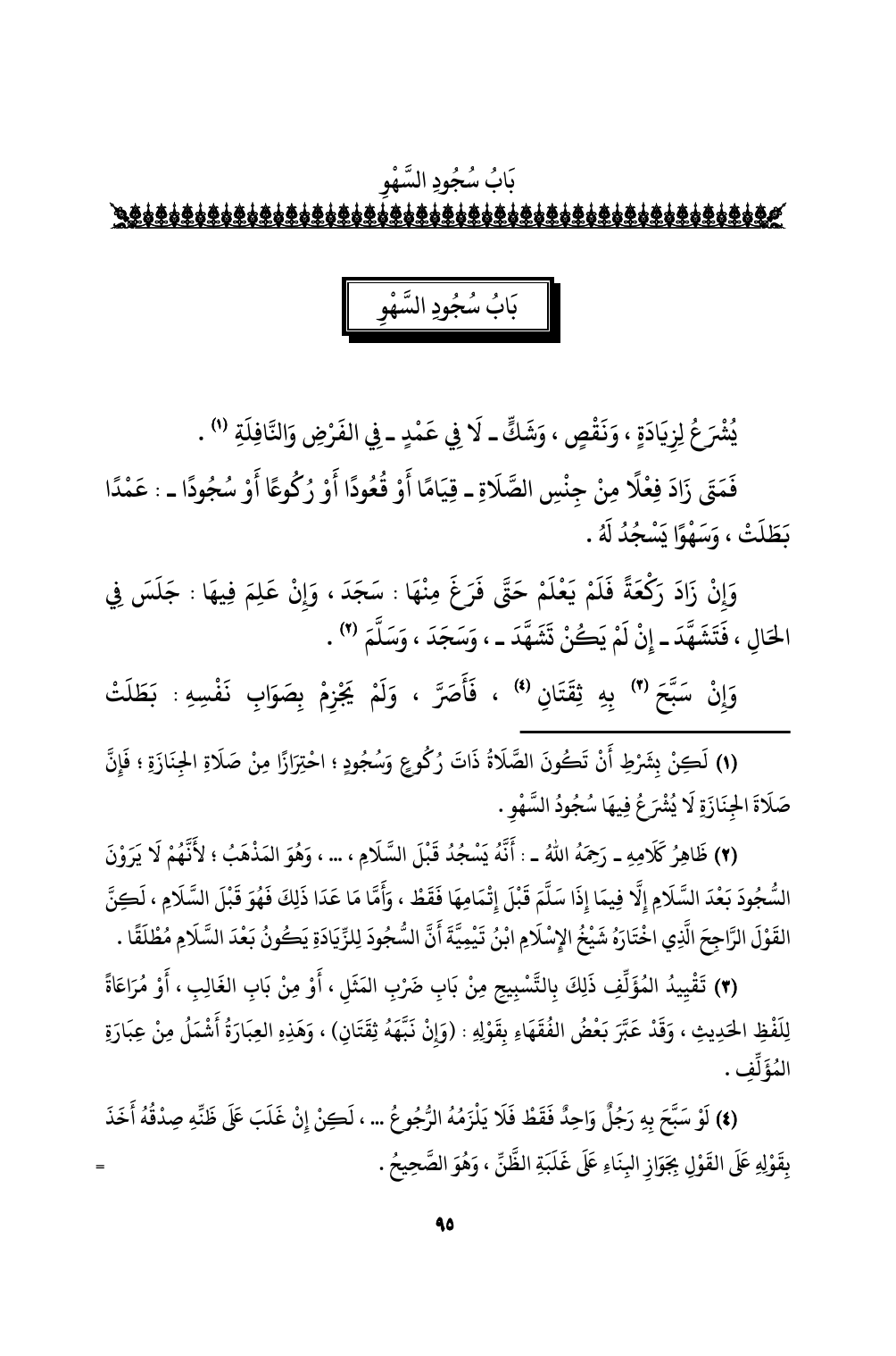 (¬2) ظاهر كلامه - رحمه الله -: أنه يسجد قبل السلام، ... ، وهو المذهب؛ لأنهم لا يرون السجود بعد السلام إلا فيما إذا سلم قبل إتمامها فقط، وأما ما عدا ذلك فهو قبل السلام، لكن القول الراجح الذي اختاره شيخ الإسلام ابن تيمية أن السجود للزيادة يكون بعد السلام مطلقًا.