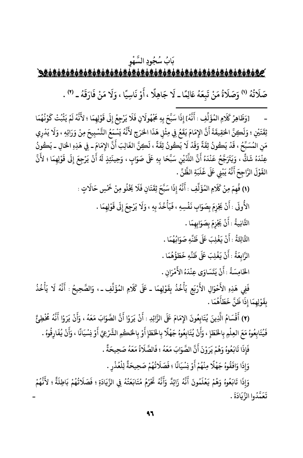 (¬2) أقسام الذين يتابعون الإمام على الزائد: أن يروا أن الصواب معه، وأن يروا أنه مخطئٌ فيتابعوه مع العلم بالخطإ، وأن يتابعوه جهلًا بالخطإ أو بالحكم الشرعي أو نسيانًا، وأن يفارقوه.