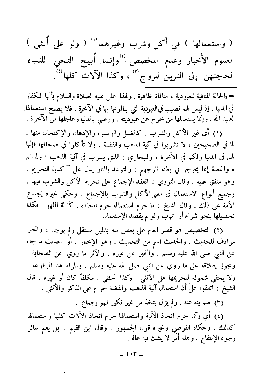 (¬2) التخصيص هو قصر العام على بعض منه بدليل مستقل ولم يوجد، والخبر مرادف للحديث والحديث اسم من التحديث وهو الإخبار أو الحديث ما جاء عن النبي صلى الله عليه وسلم والخبر عن غيره. والأثر ما روي عن الصحابة ويجوز إطلاقه على ما روي عن النبي صلى الله عليه وسلم والمراد هنا المرفوعة. ولا يخفى شموله لتحريمها على الأنثى، وكذا الخنثى، مكلفًا كان أو غيره، قال الشيخ: اتفقوا على أن استعمال آنية الذهب والفضة حرام على الذكر والأنثى.