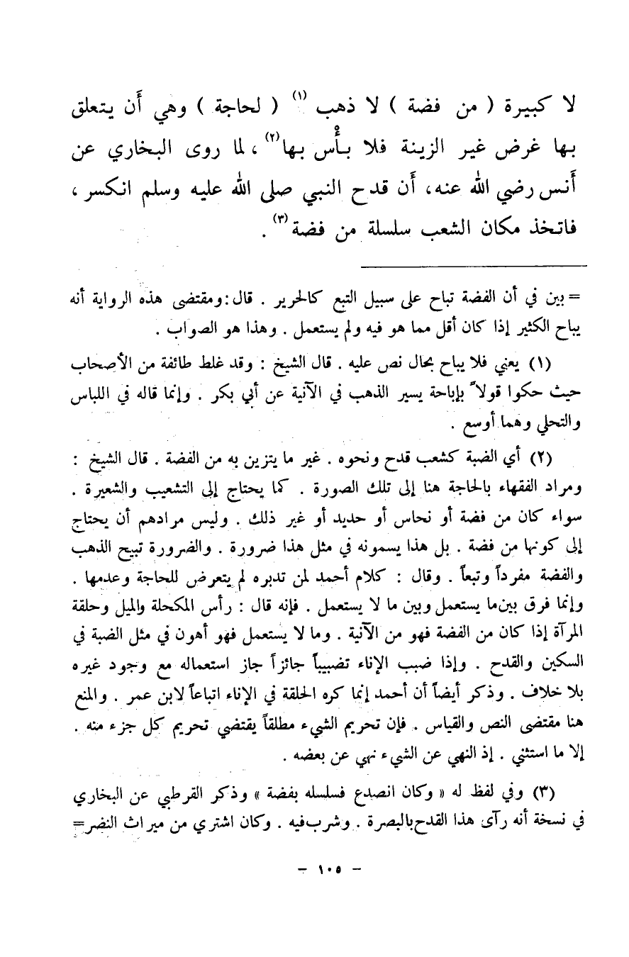 لا كبيرة (من فضة) لا ذهب (¬1) (لحاجة) وهي أن يتعلق بها غرض غير الزينة فلا بأس بها (¬2) لما روى البخاري عن أنسَ رضي الله عنه، أن قدح النبي صلى الله عليه وسلم انكسر فاتخذ مكان الشعب سلسلة من فضة (¬3) .