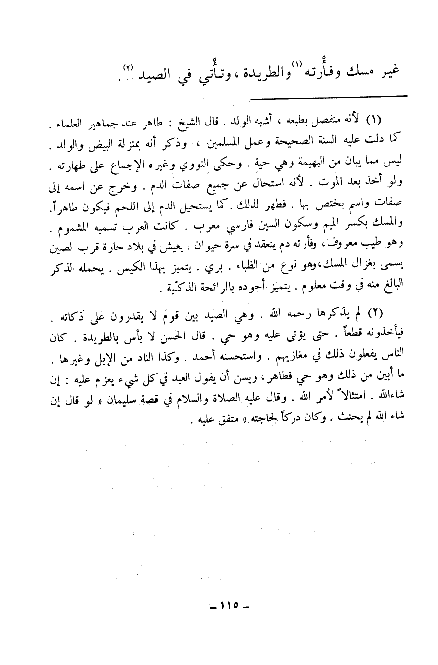 (¬1) لأنه منفصل بطبعه، أشبه الولد، قال الشيخ: طاهر عند جماهير العلماء كما دلت عليه السنة الصحيحة وعمل المسلمين، وذكر أنه بمنزلة البيض والولد ليس مما يبان من البهيمة وهي حية وحكي النووي وغيره الإجماع على طهارته ولو أخذ بعد الموت، لأنه استحال عن جميع صفات الدم، وخرج عن اسمه إلى صفات واسم يختص بها فطهر لذلك، كما يستحيل الدم إلى اللحم فيكون طاهرًا والمسك بكسر الميم وسكون السين فارسي معرب، كانت العرب تسمية المشموم وهو طيب معروف، وفأرته دم ينعقد في سرة حيوان، يعيش في بلاد حارة قرب الصين يسمى بغزال المسك، وهو نوع من الظباء، بري، يتميز بهذا الكيس يحمله الذكر البالغ منه في وقت معلوم يتميز أجوده بالرائحة الذكية.