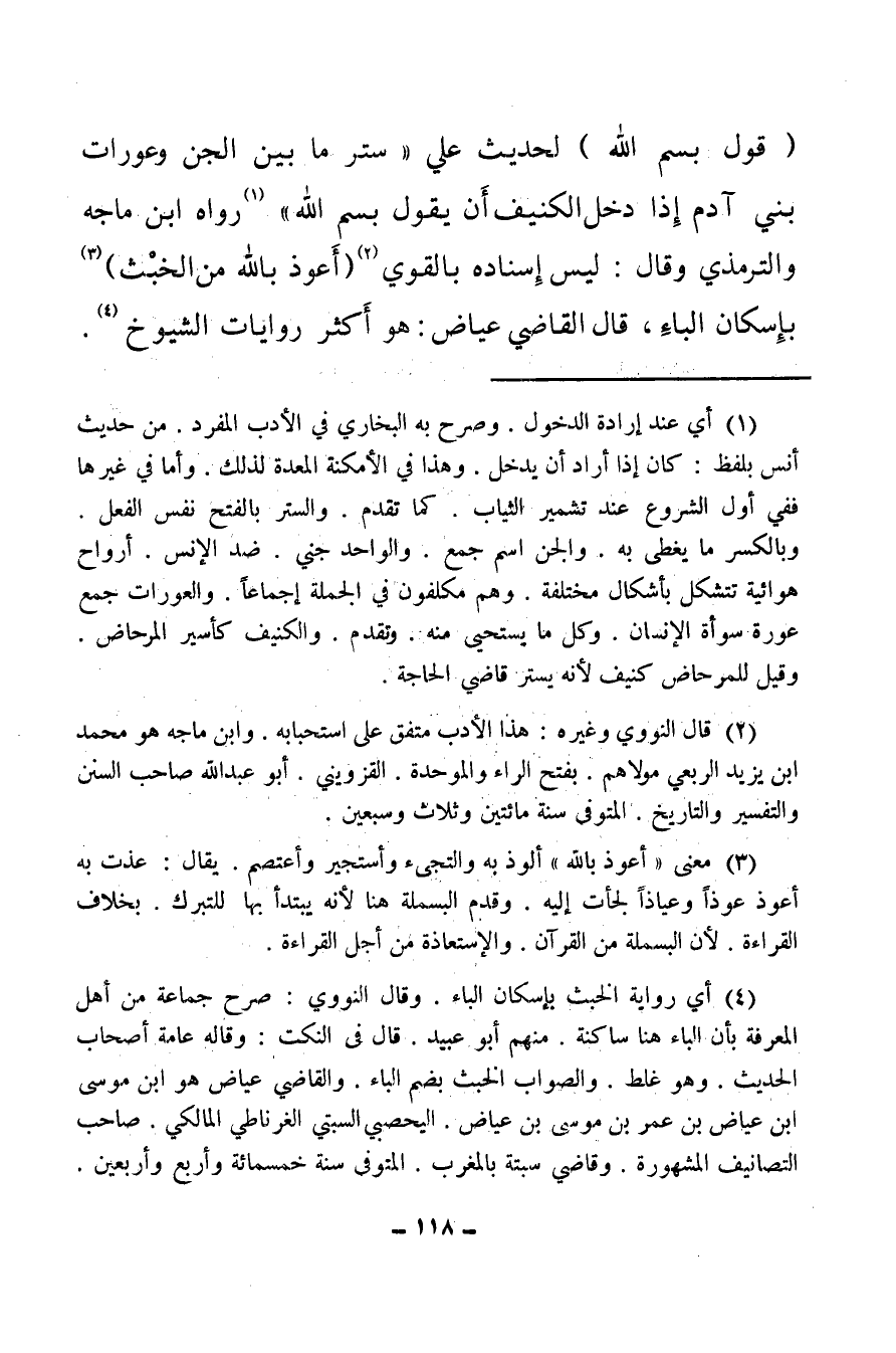 (¬2) قال النووي وغيره: هذا الأدب متفق على استحبابه وابن ماجه هو محمد بن يزيد الربعي مولاهم، بفتح الراء والموحدة القزويني أبو عبد الله صاحب السنن والتفسير والتاريخ المتوفى سنة مائتين وثلاث وسبعين.
