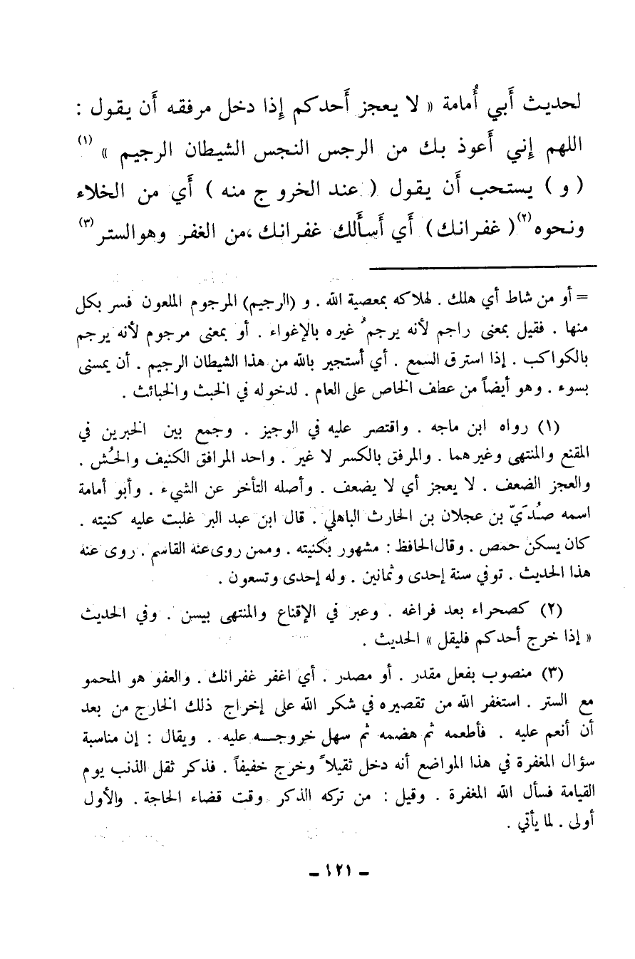 (¬1) رواه ابن ماجه، واقتصر عليه في الوجيز، وجمع بين الخبرين في المقنع والمنتهى وغيرهما والمرفق بالكسر لا غير، واحد المرافق الكنيف والحش، والعجز والضعف، لا يعجز أي لا يضعف، وأصله التأخر عن الشيء، وأبو أمامة اسمه صدي بن عجلان بن الحارث الباهلي، قال ابن عبد البر غلبت عليه كنيته، كان يسكن حمص، وقال الحافظ: مشهور بكنيته وممن روى عنه القاسم، روي عنه هذا الحديث توفي سنة إحدى وثمانين، وله إحدى وتسعون.