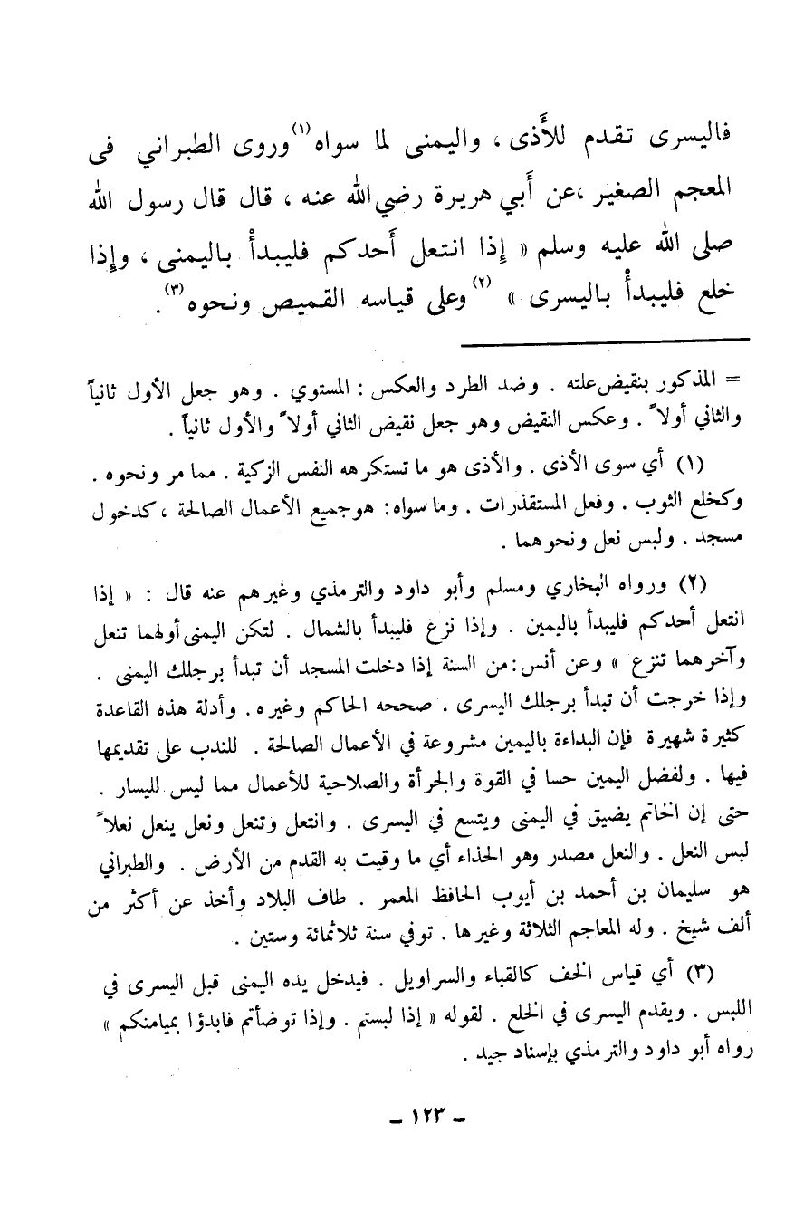 (¬2) ورواه البخاري ومسلم وأبو داود والترمذي وغيرهم عنه قال: «إذا انتعل أحدكم فليبدأ باليمين، وإذا نزع فليبدأ بالشمال، لتكن اليمنى أولهما تنعل وآخرها تنزع» ، وعن أنس: (من السنة إذا دخلت المسجد أن تبدأ برجلك اليمنى، وإذا خرجت أن تبدأ برجلك اليسرى) صححه الحاكم وغيره، وأدلة هذه القاعدة كثيرة شهيرة فإن البداءة باليمين مشروعة في الأعمال الصالحة، للندب على تقديمها فيها، ولفضل اليمين حسا في القوة والجرأة والصلاحية للأعمال مما ليس لليسار حتى إن الخاتم يضيق في اليمنى ويتسع في اليسرى، وانتعل وتنعل ونعل ينعل نعلا لبس النعل، والنعل مصدر وهو الحذاء أي ما وقيت به القدم من الأرض، والطبراني هو سليمان بن أحمد بن أيوب الحافظ المعمر، طاف البلاد وأخذ عن أكثر من ألف شيخ، وله المعاجم الثلاثة وغيرها، وتوفي سنة ثلاثمائة وستين.