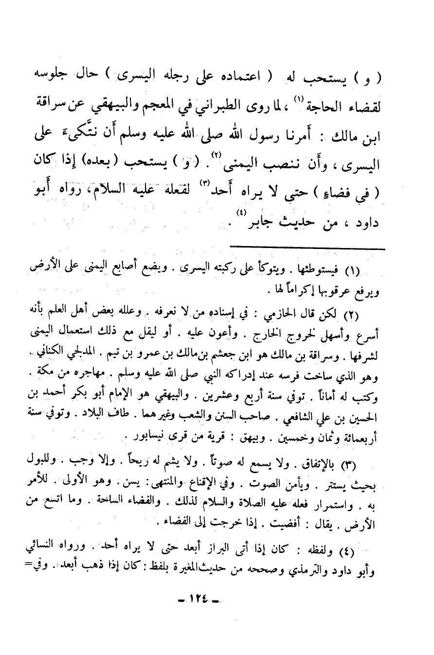 (¬4) ولفظه: (كان إذا أتى البراز أبعد حتى لا يراه أحد،) ورواه النسائي وأبو داود والترمذي وصححه من حديث المغيرة بلفظ (كان إذا ذهب أبعد) وفي الصحيحين (فانطلق حتى توارى عني) . وهذه الأحاديث وغيرها تدل على مشروعية الإبعاد لقضاء الحاجة.