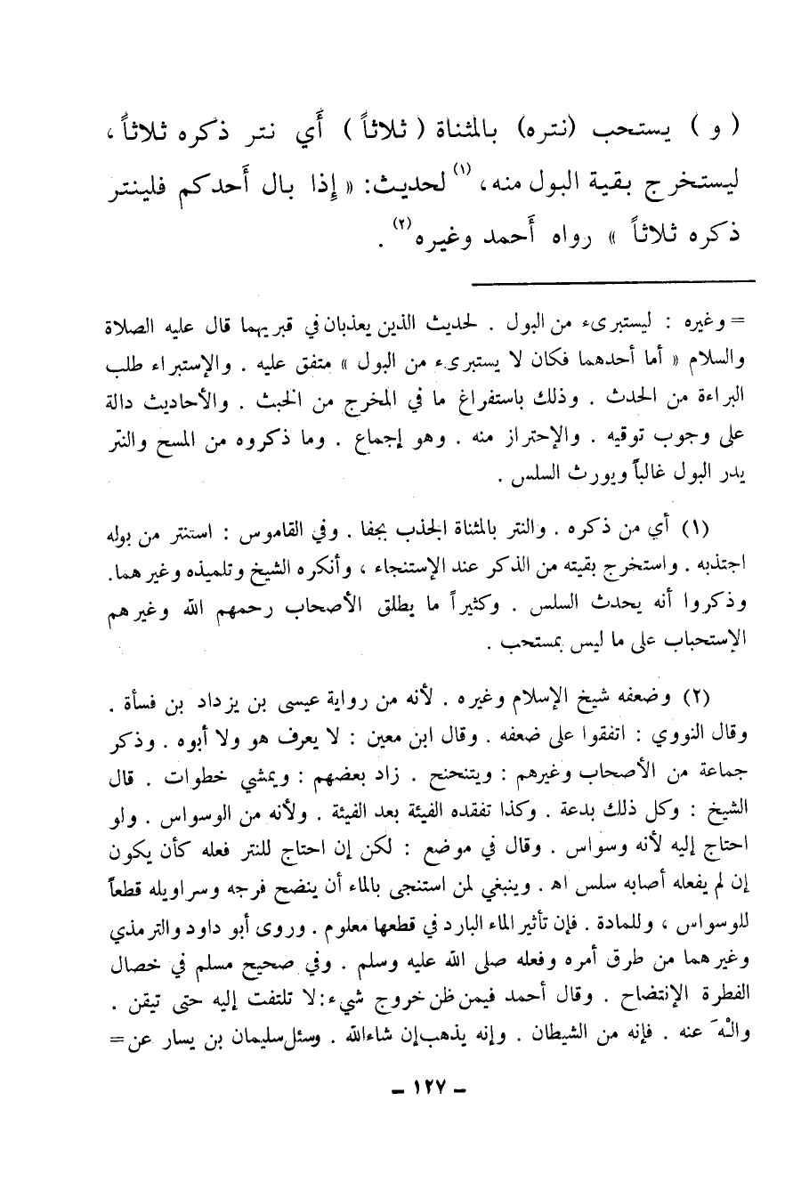 وقال في موضع: لكن إن احتاج للنتر فعله كأن يكون إن لم يفعله أصابه سلس اهـ وينبغي لمن استنجى بالماء أن ينضح فرجه وسراويله قطعا للوسواس، وللمادة فإن تأثير الماء البارد في قطعها معلوم، وروى أبو داود والترمذي وغيرهما من طرق أمره وفعله صلى الله عليه وسلم وفي صحيح مسلم في خصال الفطرة الانتضاح، وقال أحمد فيمن ظن خروج شيء (لا تلتفت إليه حتى تيقن، وإله عنه فإنه من الشيطان، وإنه يذهب إن شاء الله) ، وسئل سليمان بن يسار عن