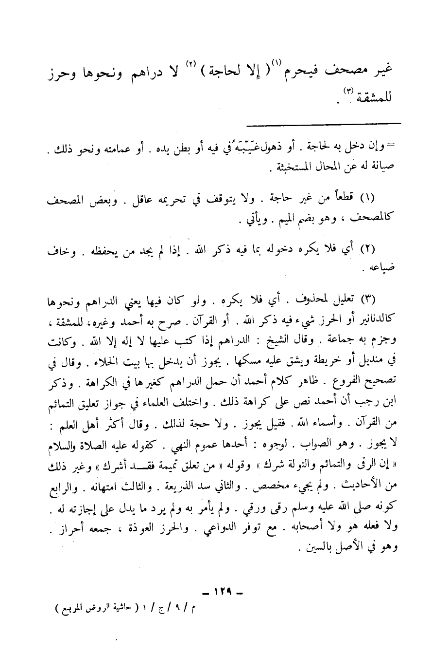 (¬3) تعليل لمحذوف أي فلا يكره ولو كان فيها يعني الدراهم ونحوها كالدنانير أو الحرز شيء فيه ذكر الله، أو القرآن صرح به أحمد وغيره للمشقة وجزم به جماعة، وقال الشيخ: الدراهم إذا كتب عليها لا إله إلا الله، وكانت في منديل أو خريطة ويشق عليه مسكها يجوز أن يدخل بها بيت الخلاء، وقال في تصحيح الفروع، ظاهر كلام أحمد أن حمل الدراهم كغيرها في الكراهة، وذكر ابن رجب أن أحمد نص على كراهة ذلك، واختلف العلماء في جواز تعليق التمائم من القرآن، وأسماء الله فقيل يجوز، ولا حجة لذلك، وقال أكثر أهل العلم: لا يجوز هو الصواب لوجوه أحدها عموم النهي، كقوله عليه الصلاة والسلام «إن الرقي والتمائم والتولة شرك» ، وقوله: «من تعلق تميمة فقد أشرك» ، وغير ذلك من الأحاديث، ولم يجئ مخصص، والثاني سد الذريعة، والثالث امتهانة والرابع كونه صلى الله عليه وسلم رقى ورقي، ولم يأمر به ولم يرد ما يدل على إجازته له، ولا فعله هو ولا أصحابه مع توفر الدواعي، والحرز العوذة، جمعه أحراز، وهو في الأصل بالسين.