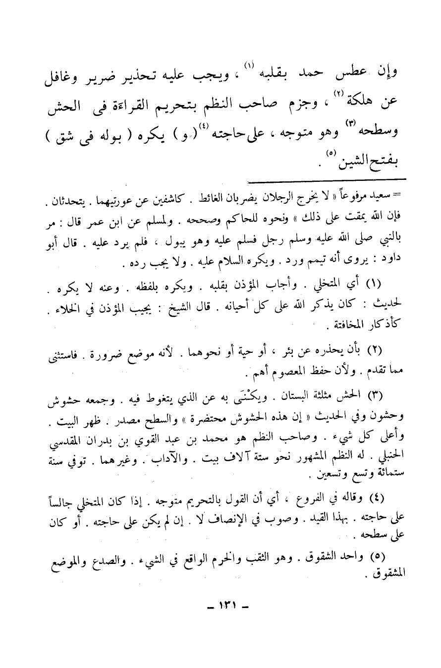 (¬3) الحش مثلثة البستان، ويكنى به عن الذي يتغوط فيه، وجمعه حشوش وحشون وفي الحديث: «إن هذه الحشوش محتضرة» والسطح مصدر، ظهر البيت وأعلى كل شيء، وصاحب النظم هو محمد بن عبد القوي بن بدران المقدسي الحنبلي، له النظم المشهور نحو ستة آلاف بيت، والآداب وغيرهما توفي سنة ستمائة وتسع وتسعين.