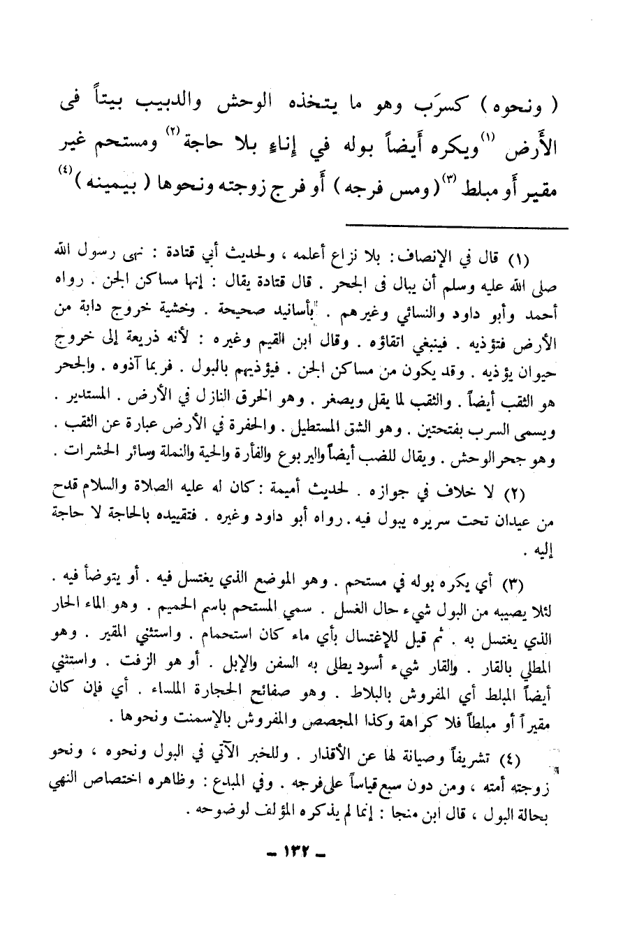 (¬1) قال في الإنصاف: بلا نزاع أعلمه، ولحديث أبي قتادة، (نهى رسول الله صلى الله عليه وسلم أن يبال في الجُحر) قال قتادة يقال: إنها مساكن الجن، رواه أحمد وأبو داود والنسائي وغيرهم بأسانيد صحيحة، وخشية خروج دابة من الأرض فتؤذيه فينبغي اتقاؤه وقال ابن القيم وغيره: لأنه ذريعة إلى خروج حيوان يؤذيه وقد يكون من مساكن الجن فيؤذيهم بالبول، فربما آذوه والجحر هو الثقب أيضا، والثقب لما يقل ويصغر، وهو الخرق النازل في الأرض المستدير ويسمى السرب بفتحتين، وهو الشق المستطيل والحفرة في الأرض عبارة عن الثقب وهو جحر الوحش ويقال للضب أيضا واليربوع والفأرة والحية والنملة وسائر الحشرات.