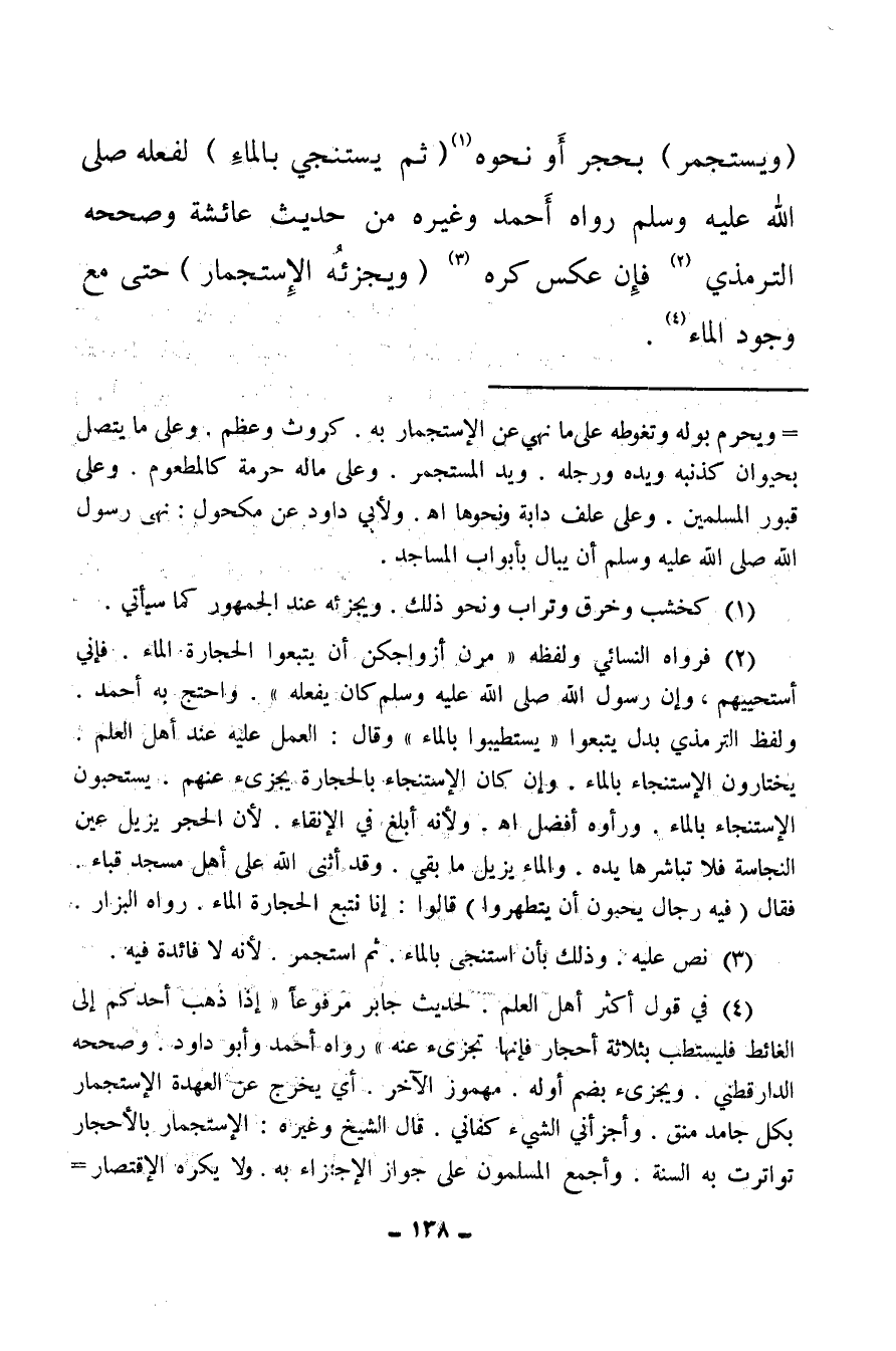 (ويستجمر) بحجر أو نحوه (¬1) (ثم يستنجي بالماء) لفعله صلى الله عليه وسلم رواه أحمد وغيره من حديث عائشة وصححه الترمذي (¬2) فإن عكس كره (¬3) ويجزئه الاستجمار حتى مع وجود الماء (¬4) .