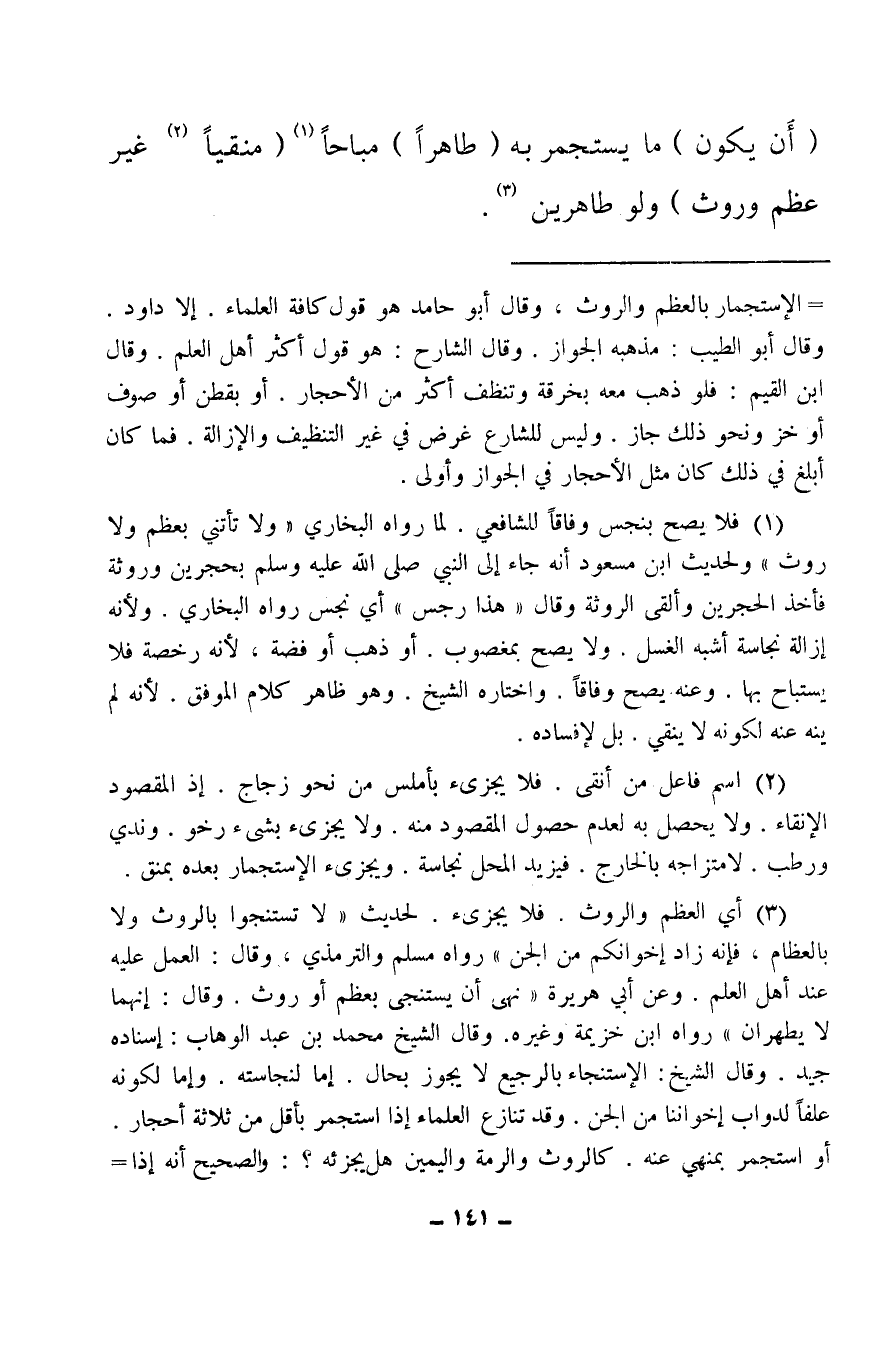 (¬3) أي العظم والروث، فلا يجزئ لحديث «لا تستنجوا بالروث ولا بالعظام فإنه زاد إخوانكم من الجن» رواه مسلم والترمذي، وقال: العمل عليه عند أهل العلم، وعن أبي هريرة (نهى أن يستنجى بعظم أو روث) ، وقال: «إنهما لا يطهران» رواه ابن خزيمة وغيره، وقال الشيخ محمد بن عبد الوهاب، إسناده جيد، وقال الشيخ: الاستنجاء بالرجيع لا يجوز بحال، إما لنجاسته، وإما لكون علفا لدواب إخواننا من الجن، وقد تنازع العلماء إذا استجمر بأقل من ثلاثة أحجار، أو استجمر بمنهي عنه كالروث والرمة واليمين هل يجزئه؟ والصحيح أنه إذا استجمر بأقل من ثلاثة أحجار فعليه تكميل المأمور به، وأما إذا استجمر بالعظم واليمين فإنه قد يجزئه، فإنه قد حصل المقصود بذلك، وإن كان عاصيا، والإعادة لا فائدة فيها، ولكن يؤمر بتنظيف العظم مما لوثه به، قال الزركشي، وهو جيد والروث للفرس والبغل والحمار والخثي بكسر فسكون للبقر والفيل، والبعر للإبل والغنم والأرانب، والعذرة للإنسان.