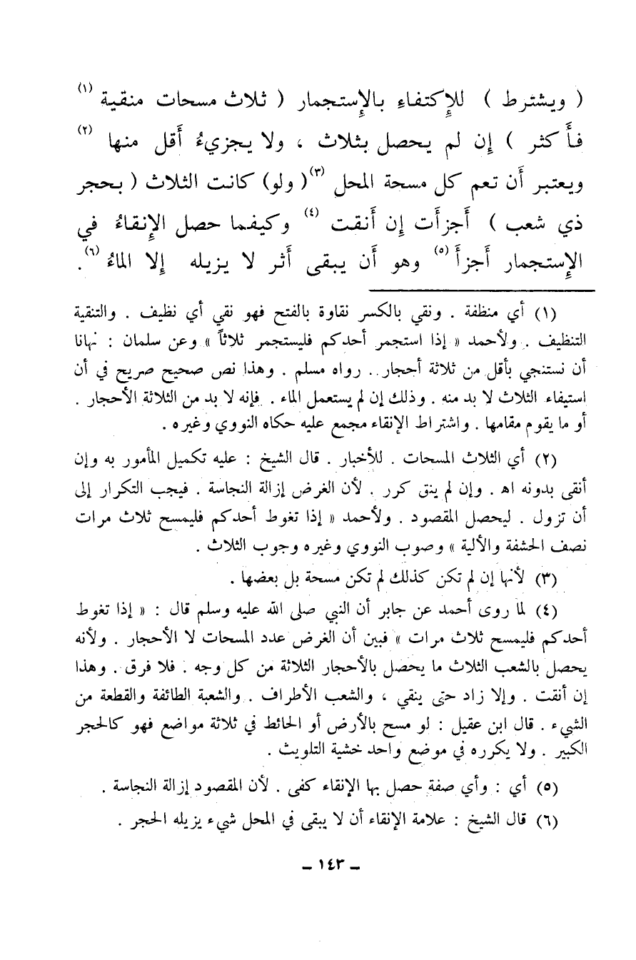 (¬1) أي منظفة، ونقي بالكسر نقاوة بالفتح فهو نقي أي نظيف، والتنقية التنظيف ولأحمد «إذا استجمر أحدكم فليستجمر ثلاثا» وعن سلمان «نهانا أن نستنجي بأقل من ثلاثة أحجار» رواه مسلم وهذا نص صحيح صريح في أن استيفاء الثلاث لا بد منه وذلك إن لم يستعمل الماء فإنه لا بد من الثلاث الأحجار أو ما يقوم مقامها واشتراط الإنقاء مجمع عليه حكاه النووي وغيره.
