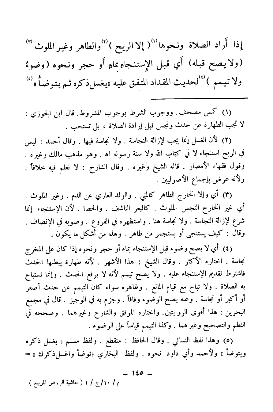 (¬4) أي لايصح وضوء قبل الاستنجاء بماء أو حجر ونحوه إذا كان على المخرج نجاسة، اختاره الأكثر، وقال الشيخ هذا الأشهر، لأنه طهارة يبطلها الحدث فاشترط تقديم الاستنجاء عليه، ولا يصح تيمم لأنه لا يرفع الحدث، وإنما تستباح به الصلاة، ولا تباح مع قيام المانع، وظاهره سواء كان التيمم عن حدث أصغر أو أكبر أو نجاسةوعنه يصح الوضوء وفاقا، وجزم به في الوجيز، قال في مجمع البحرين، هذا أقوى الروايتين، واختاره الموفق والشارح وغيرهما، وصححه في النظم والتصحيح وغيرهما، وكذا التيمم قياسا على الوضوء.