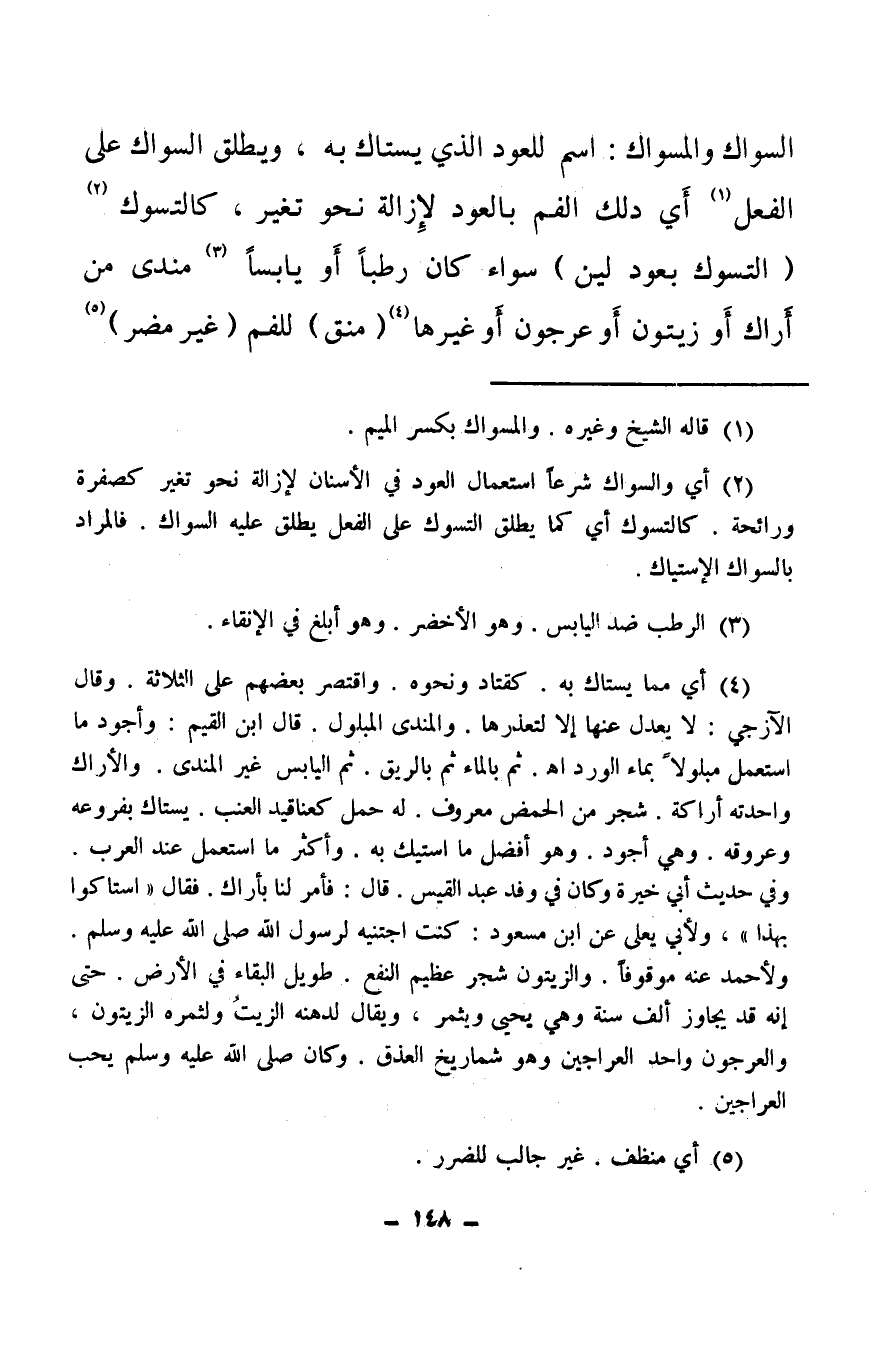 (¬4) أي مما يستاك به، كقتاد ونحوه، واقتصر بعضهم على الثلاثة، وقال الآزجي، لا يعدل عنها إلا لتعذرها والمندى المبلول قال ابن القيم: وأجود ما استعمل مبلولا بماء الورد اهـ ثم بالماء ثم بالريق، ثم اليابس غير المندى، والأراك واحدته أراكة. شجر من الحمض معروف له حمل كعناقيد العنب، يستاك بفروعه وعروقه، وهي أجود، وهو أفضل ما استيك به، وأكثر ما استعمل عند العرب، وفي حديث أبي خيرة وكان في وفد عبد القيس، قال: فأمر لنا بأراك فقال: استاكوا بهذا، ولأبي يعلي عن ابن مسعود: كنت اجتنيه لرسول الله صلى الله عليه وسلم ولأحمد عنه موقوفا، والزيتون شجر عظيم النفع، طويل البقاء في الأرض، حتى إنه قد يجاوز ألف سنة وهي يحي ويثمر، ويقال لدهنه الزيت ولثمره الزيتون، والعرجون واحد العراجين وهو شماريخ العذق، وكان صلى الله عليه وسلم يحب العراجين.