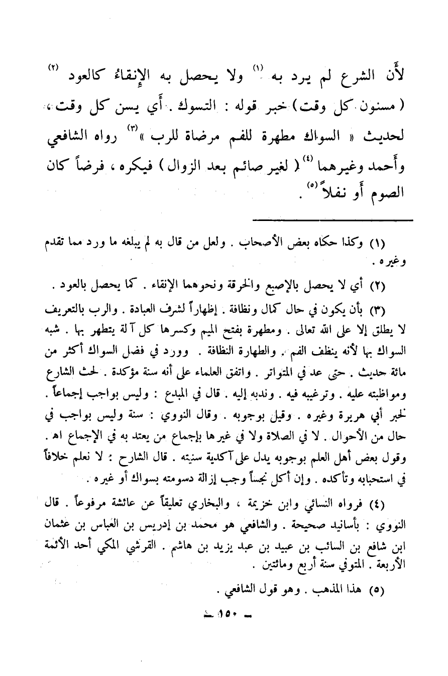 (¬3) بأن يكون في حال كمال ونظافة إظهارًا لشرف العبادة، والرب بالتعريف لا يطلق إلى على الله تعالى، ومطهرة بفتح الميم وكسرها كل آلة يتطهر بها، شبه السواك بها لأنه ينظف الفم، والطهارة النظافة، وورد في فضل السواك أكثر من مائة حديث، حتى عد في المتواتر، واتفق العلماء على أنه سنة مؤكدة، لحث الشارع ومواظبته عليه، وترغيب فيه، وندبه إليه، قال في المبدع: وليس بواجب إجماعا لخبر أبي هريرة وغيره، وقيل بوجوبه، وقال النووي: سنة وليس بواجب في حال من الأحوال، لا في الصلاة ولا في غيرها بإجماع من يعتد به في الإجماع اهـ.
