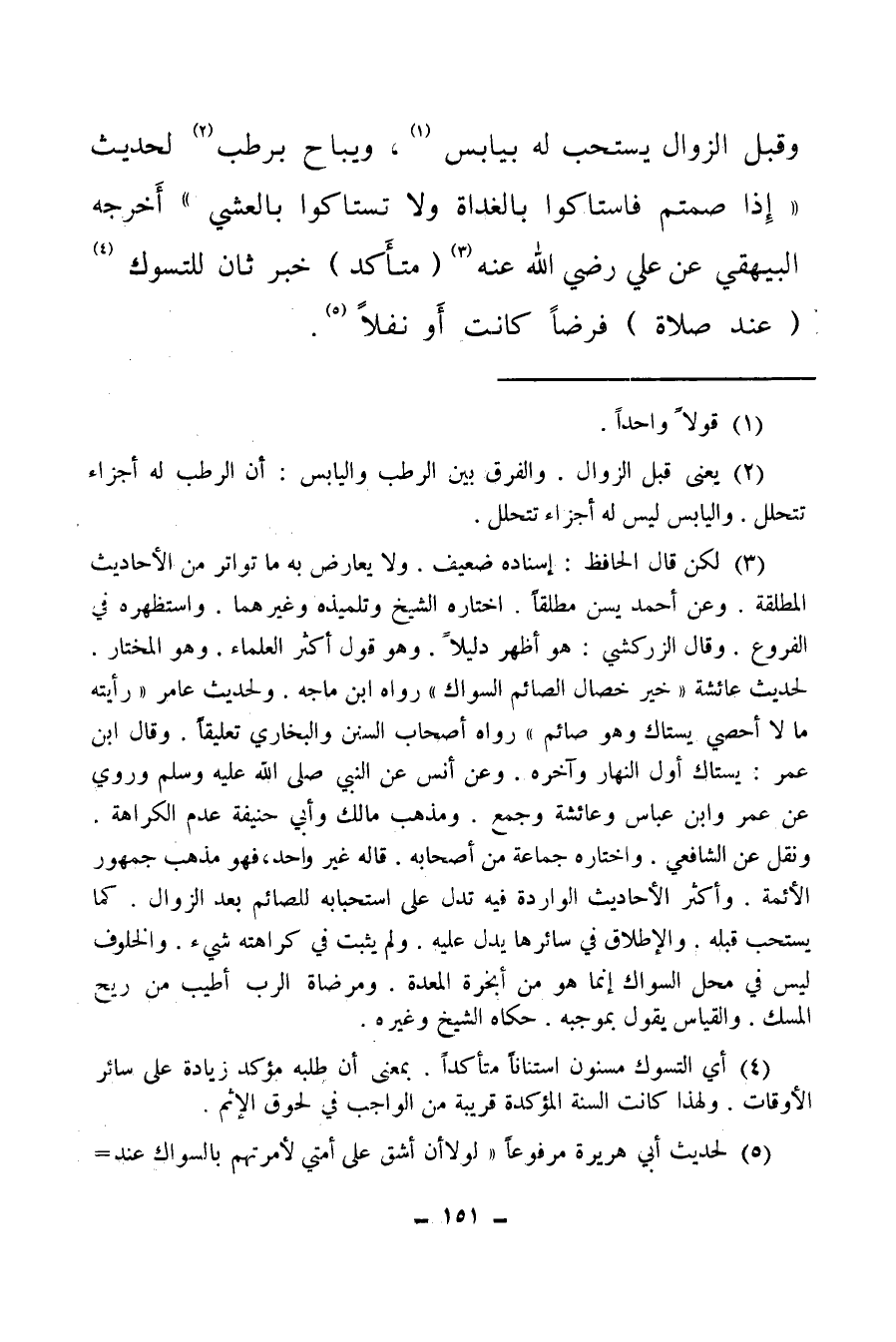 (¬3) لكن قال الحافظ: إسناده ضعيف ولا يعارض به ما تواتر من الأحاديث المطلقة وعن أحمد يسن مطلقا، اختاره الشيخ وتلميذه وغيرهما، واستظهره في الفروع، وقال الزركشي، هو أظهر دليلا وهو قول أكثر العلماء، وهو المختار لحديث عائشة «خير خصال الصائم السواك» ، رواه ابن ماجه، ولحديث عامر رأيته ما لا أحصي يستاك وهو صائم، رواه أصحاب السنن والبخاري تعليقا، وقال ابن عمر: يستاك أول النهار وآخره، وعن أنس عن النبي صلى الله عليه وسلم وروي عن عمر وابن عباس وعائشة وجمع، ومذهب مالك وأبي حنيفة عدم الكراهة ونقل عن الشافعي، واختاره جماعة من أصحابه، قاله غير واحد فهو مذهب جمهور الأئمة، وأكثر الأحاديث الواردة فيه تدل على استحبابه للصائم بعد الزوال، كما يستحب قبله، والإطلاق في سائرها يدل عليه، ولم يثبت في كراهته شيء، والخلوف ليس في محل السواك إنما هو من أبخرة المعدة، ومرضاة الرب أطيب من ريح المسك، والقياس يقول بموجبه، حكاه الشيخ وغيره.