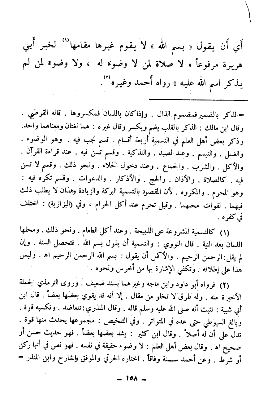 وغيرهم قال الخلال إنه الذي استقرت عليه الرواية لأن الله تعالى قال: {إِذَا قُمْتُمْ إِلَى الصَّلاةِ فَاغْسِلُوا وُجُوهَكُمْ} والرسول صلى الله عليه وسلم ذكر الوضوء ولم يذكر إيجاب التسمية، والحديث قال فيه الحافظ وغيره: يروى بأسانيد كلها ضعاف لا تقوم بها حجة، ولأنها طهارة فلا تفتقر إلى التسمية، وعبادة فلا تجب فيه كسائر العبادات.