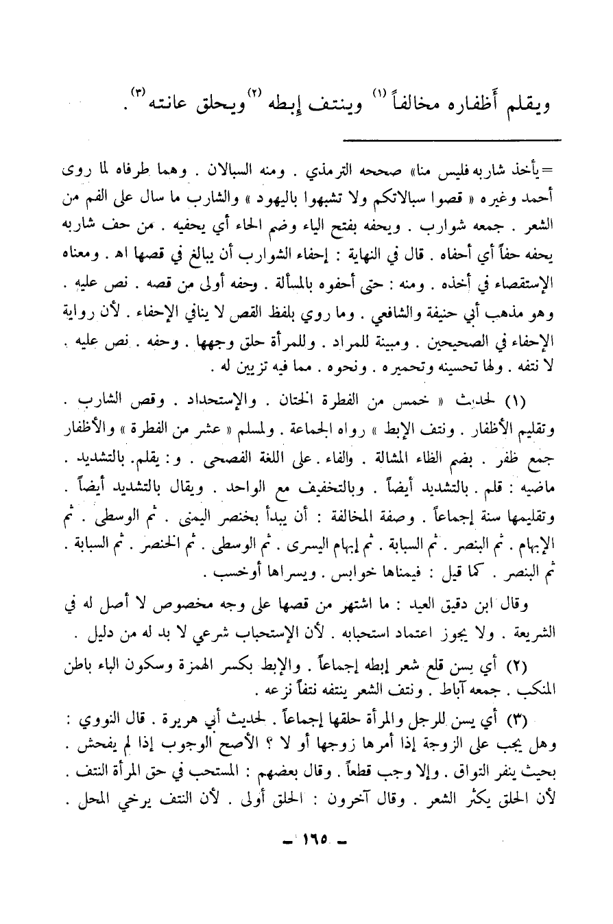 (¬1) لحديث خمس من الفطرة الختان، والاستحداد، وقص الشارب، وتقليم الأظافر، ونتف الإبط رواه الجماعة، ولمسلم عشر من الفطرة والأظفار جمع ظفر. بضم الظاء المشالة، والفاء، على اللغة الفصحى، ويقلم بالتشديد ماضيه: قلم بالتشديد أيضا، وبالتخفيف مع الواحد، ويقال بالتشديد أيضا وتقليمها سنة إجماعا، وصفة المخالفة: أن يبدأ بخنصر اليمنى، ثم الوسطى، ثم الإبهام ثم البنصر ثم السبابة، ثم إبهام اليسرى، ثم الوسطى، ثم الخنصر، ثم السبابة ثم البنصر كما قيل: فيمناها خوابس ويسراها أو خسب.