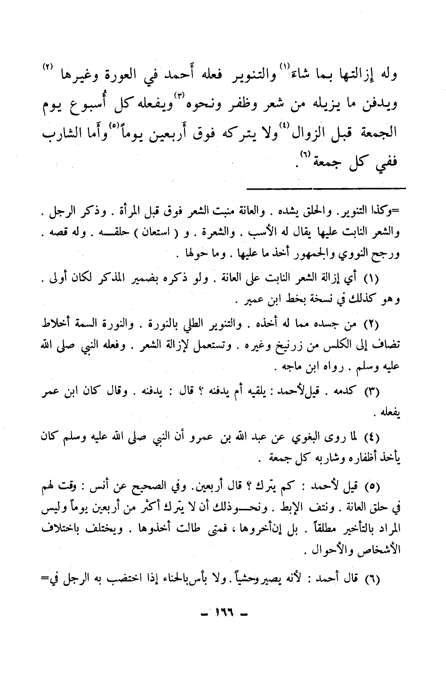 (¬2) من جسده مما له أخذه والتنوير الطلي بالنورة والنورة السمة أخلاط تضاف إلى الكلس من زرنيخ وغيره، وتستعمل لإزالة الشعر، وفعله النبي صلى الله عليه وسلم رواه ابن ماجه.