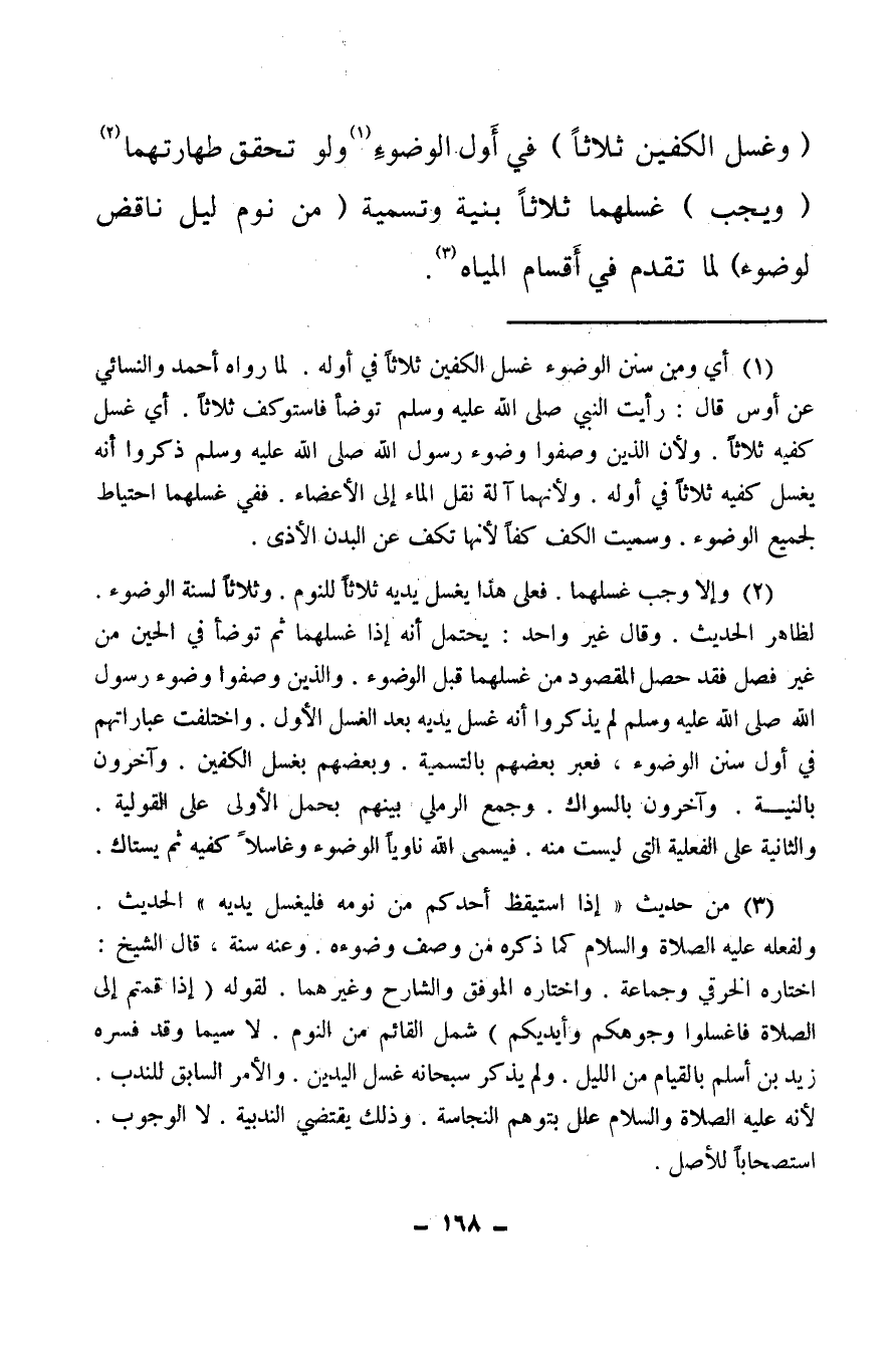(¬3) من حديث إذا استيقظ أحدكم من نومه فليغسل يديه الحديث ولفعله عليه الصلاةوالسلام كما ذكره من وصف وضوءه، وعنه سنة قال الشيخ: اختاره الخرقي وجماعة، واختاره الموفق والشارح وغيرهما لقوله: {إِذَا قُمْتُمْ إِلَى الصَّلاةِ فَاغْسِلُوا وُجُوهَكُمْ وَأَيْدِيَكُمْ} شمل القائم من النوم، لا سيما وقد فسره زيد بن أسلم بالقيام من الليل، ولم يذكر سبحانه غسل اليدين، والأمر السابق للندب لأنه عليه الصلاة والسلام علل بتوهم النجاسة، وذلك يقتضي الندبية لا الوجوب استصحابا للأصل.