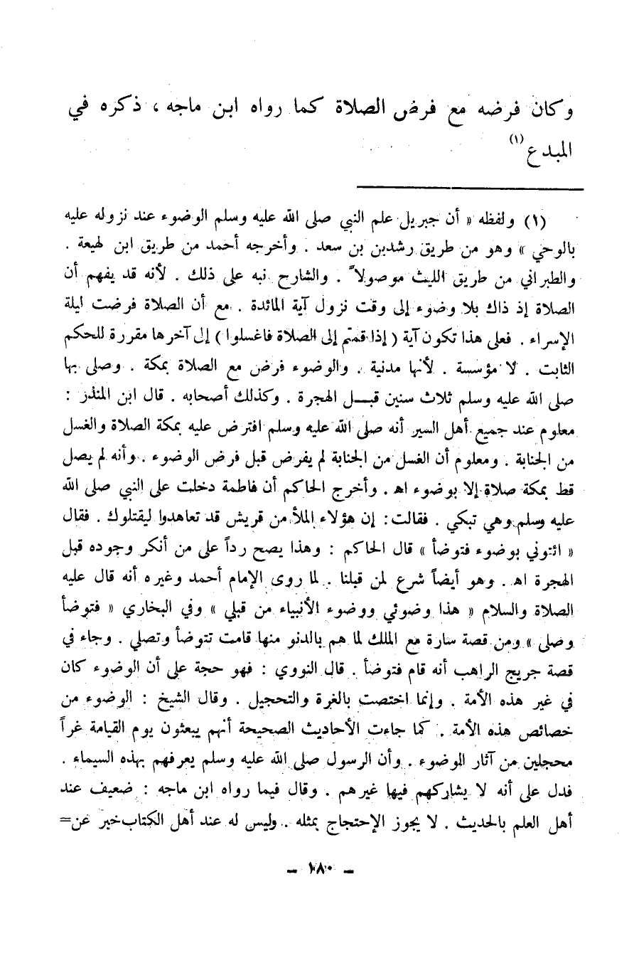 وأخرج الحاكم أن فاطمة دخلت على النبي صلى الله عليه وسلم وهي تبكي، فقال: إن هؤلاء الملأ من قريش قد تعاهدوا ليقتلوك، فقال ائتوني بوضوء فتوضأ، قال الحاكم: وهذا يصح ردا على من أنكر وجوده قبل الهجرة اهـ، وهو أيضا شرع لمن قبلنا، لما روى الإمام أحمد وغيره أنه قال عليه الصلاة والسلام هذا وضوئي ووضوء الأنبياء من قبلي، وفي البخاري فتوضأ وصلى، ومن قصة سارة مع الملك لما هم بالدنو منها قامت تتوضأ وتصلي. وجاء في قصة جريج الراهب أنه قام فتوضأ. قال النووي فهو حجة على أن الوضوء كان في غير هذه الأمة، وإنما اختصت بالغرة والتحجيل. وقال الشيخ: الوضوء من خصائص هذه الأمة، كما جاءت الأحاديث الصحيحة أنهم يبعثون يوم القيامة غرا محجلين من آثار الوضوء، وأن الرسول صلى الله عليه وسلم يعرفهم بهذه السيماء، فدل على أنه لا يشاركهم فيها غيرهم. وقال فيما رواه ابن ماجه: ضعيف عند أهل العلم بالحديث، لا يجوز الاحتجاج بمثله، وليس له عند أهل الكتاب خبر عن