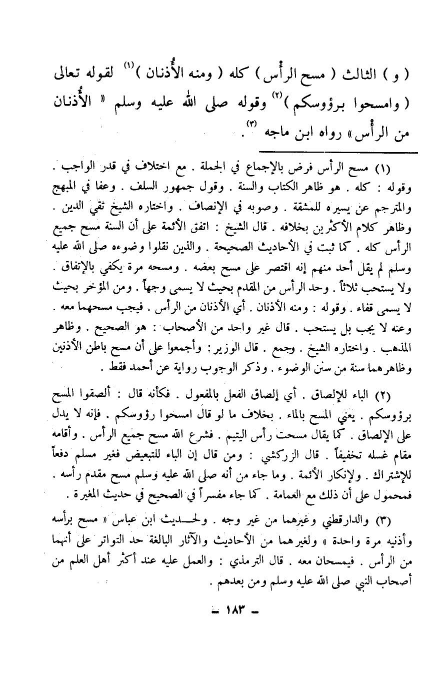 (¬3) والدارقطني وغيرهما من غير وجه، ولحديث ابن عباس، مسح برأسه وأذنيه مرة واحدة ولغيرهما من الأحاديث والآثار البالغة حد التواتر على أنهما من الرأس، فيمسحان معه، قال الترمذي: والعمل عليه عند أكثر أهل العلم من أصحاب النبي صلى الله عليه وسلم ومن بعدهم.