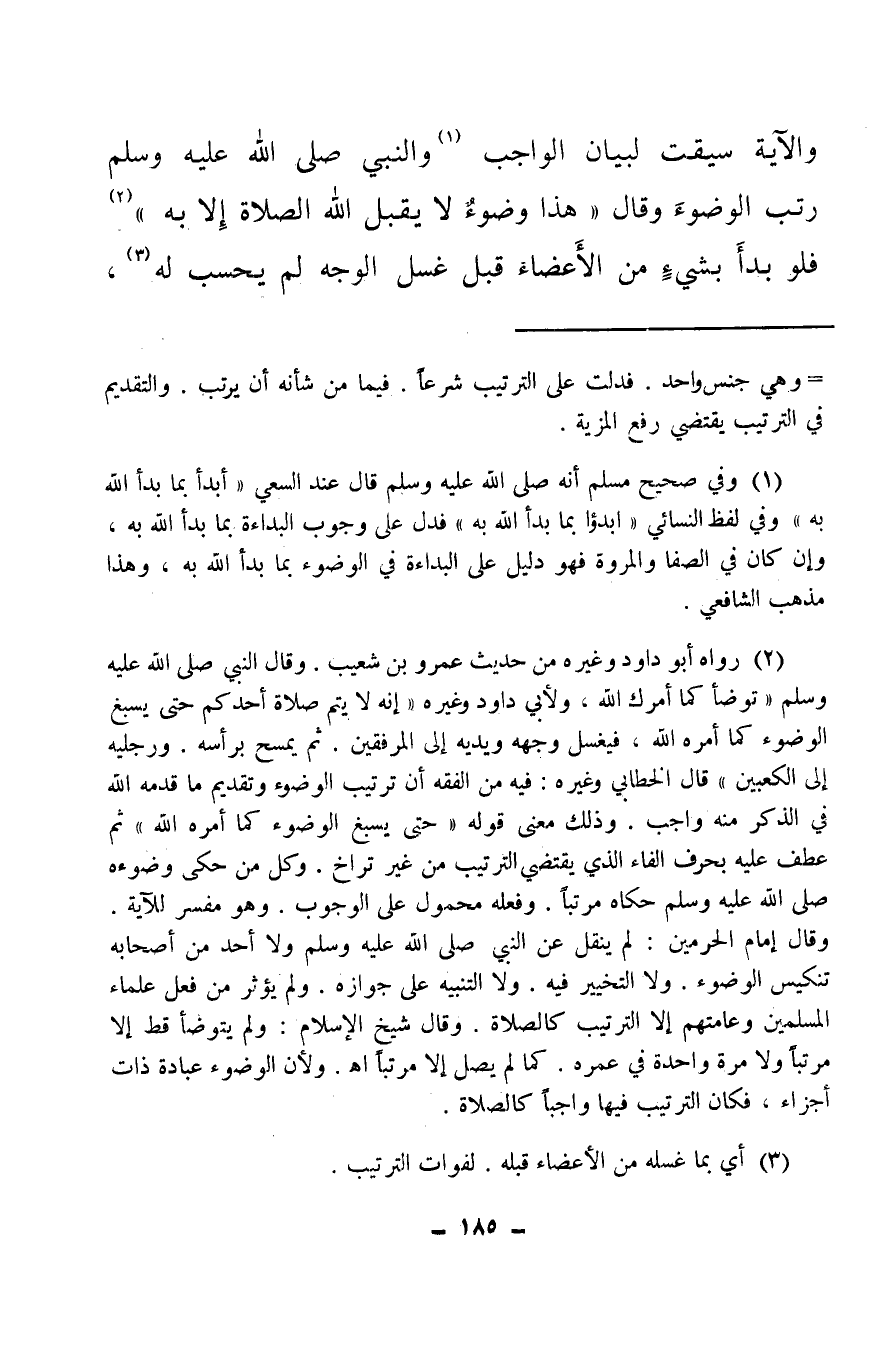 (¬1) وفي صحيح مسلم أنه صلى الله عليه وسلم قال عند السعي أبدأ بما بدأ الله به، وفي لفظ النسائي ابدءوا بما بدأ الله به، فدل على وجوب البداءة بما بدأ الله به، وإن كان في الصفا والمروة فهو دليل على البداءة في الوضوء بما بدأ الله به، وهذا مذهب الشافعي.