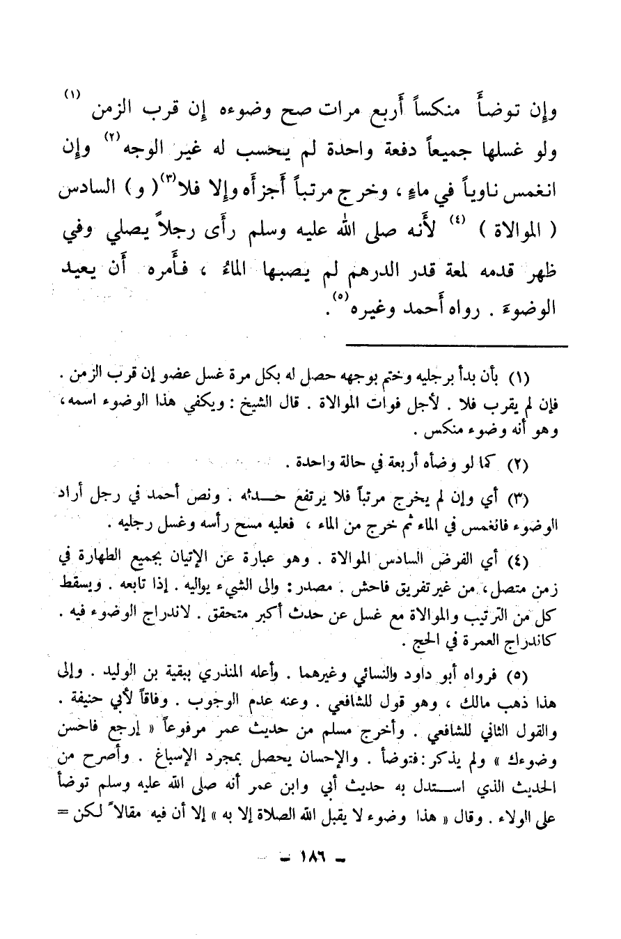 (¬5) فرواه أبو داود والنسائي وغيرهما، وأعله المنذري ببقية بن الوليد، وإلى هذا ذهب مالك وهو قول للشافعي وعنه عدم الوجوب وفاقا لأبي حنيفة والقول الثاني للشافعي وأخرج مسلم من حديث عمر مرفوعا، ارجع فاحسن وضوءك ولم يذكر فتوضأ والإحسان يحصل بمجرد الإسباغ، وأصرح من الحديث الذي استدل به حديث أبي وابن عمر أنه صلى الله عليه وسلم توضأ على الولاء، وقال: هذا وضوء لا يقبل الله الصلاة إلا به، إلا أن فيه مقالا لكن
