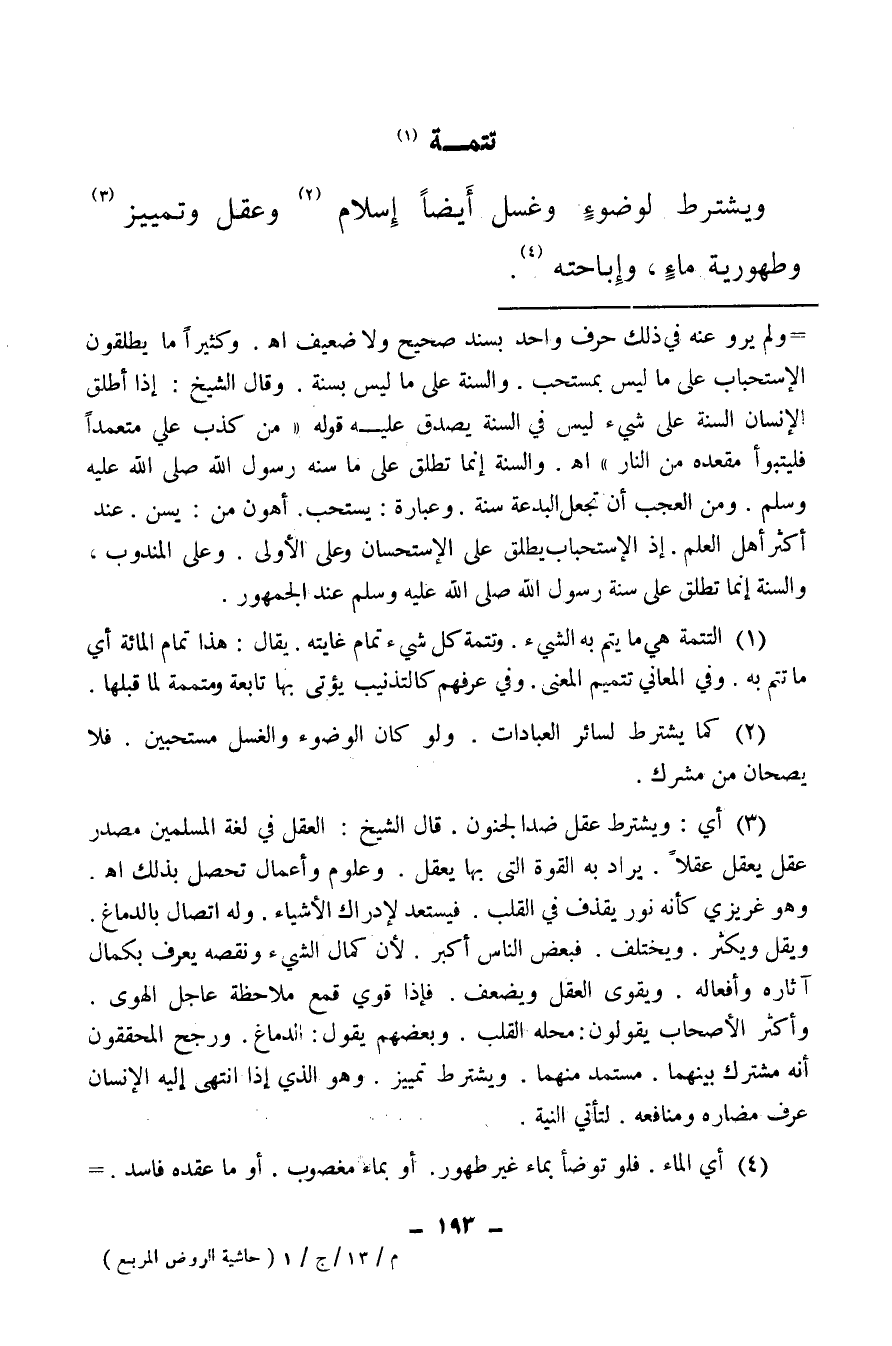 (¬3) أي: ويشترط عقل ضد الجنون قال الشيخ: العقل في لغة المسلمين مصدر عقل يعقل عقلا، يراد به القوة التي بها يعقل، وعلوم وأعمال تحصل بذلك اهـ وهو غريزي كأنه نور يقذف في القلب، فيستعد لإدراك الأشياء، وله اتصال بالدماغ ويقل ويكثر ويختلف، فبعض الناس أكبر، لأن كمال الشيء ونقصه يعرف بكمال آثاره وأفعاله، ويقوي العقل ويضعف فإذا قوي قمع ملاحظة عاجل الهوى وأكثر الأصحاب يقولون: محله القلب، وبعضهم يقول: الدماغ ورجح المحققون أنه مشترك بينهما. مستمد منهما، ويشترط تمييز وهو الذي إذا انتهى إليه الإنسان عرف مضاره ومنافعه لتأتي النية.