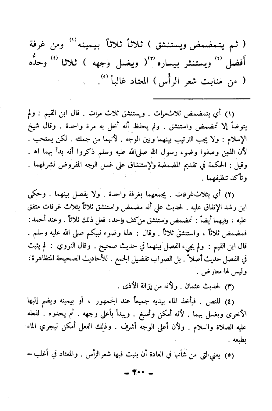 (¬2) أي بثلاث غرفات، يجمعهما بغرفة واحدة، ولا يفصل بينهما، وحكى ابن رشد الاتفاق عليه، لحديث علي أنه مضمض واستنشق ثلاثا بثلاث غرفات متفق عليه، وفيهما أيضا: تمضمض واستنشق من كف واحد، فعل ذلك ثلاثا، وعند أحمد: فمضمض ثلاثا، واستنشق ثلاثا، وقال: هذا وضوء نبيكم صلى الله عليه وسلم قال ابن القيم: ولم يجيء الفصل بينهما في حديث صحيح. وقال النووي: لم يثبت في الفصل حديث أصلا. بل الصواب تفضيل الجمع، للأحاديث الصحيحة المتظاهرة، وليس لها معارض.