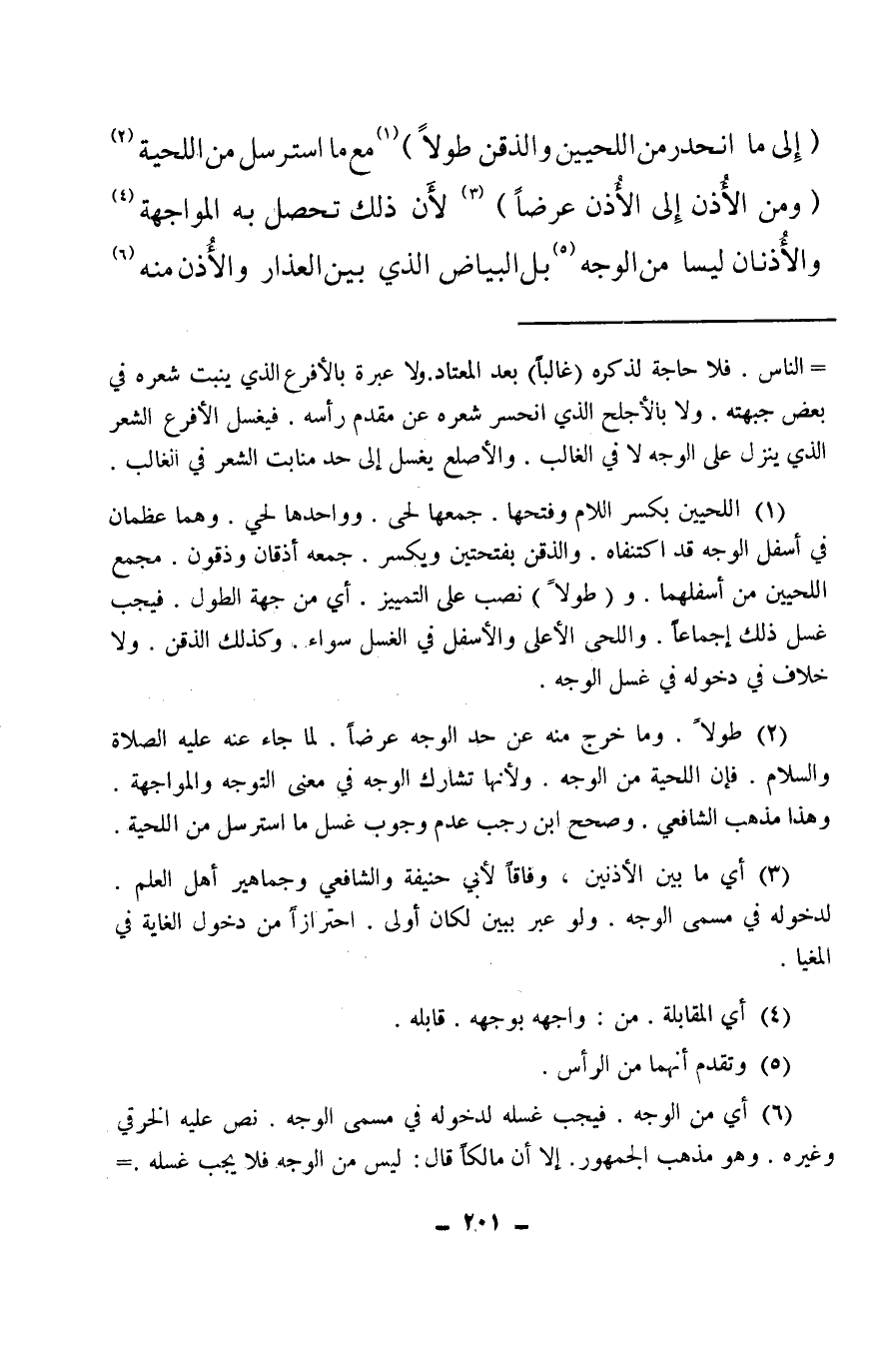 (¬2) طولا وما خرج منه عن حد الوجه عرضا، لما جاء عنه عليه الصلاة والسلام فإن اللحية من الوجه ولأنها تشارك الوجه في معنى التوجه والمواجهة وهذا مذهب الشافعي، وصحح ابن رجب عدم وجوب غسل ما استرسل من اللحية.