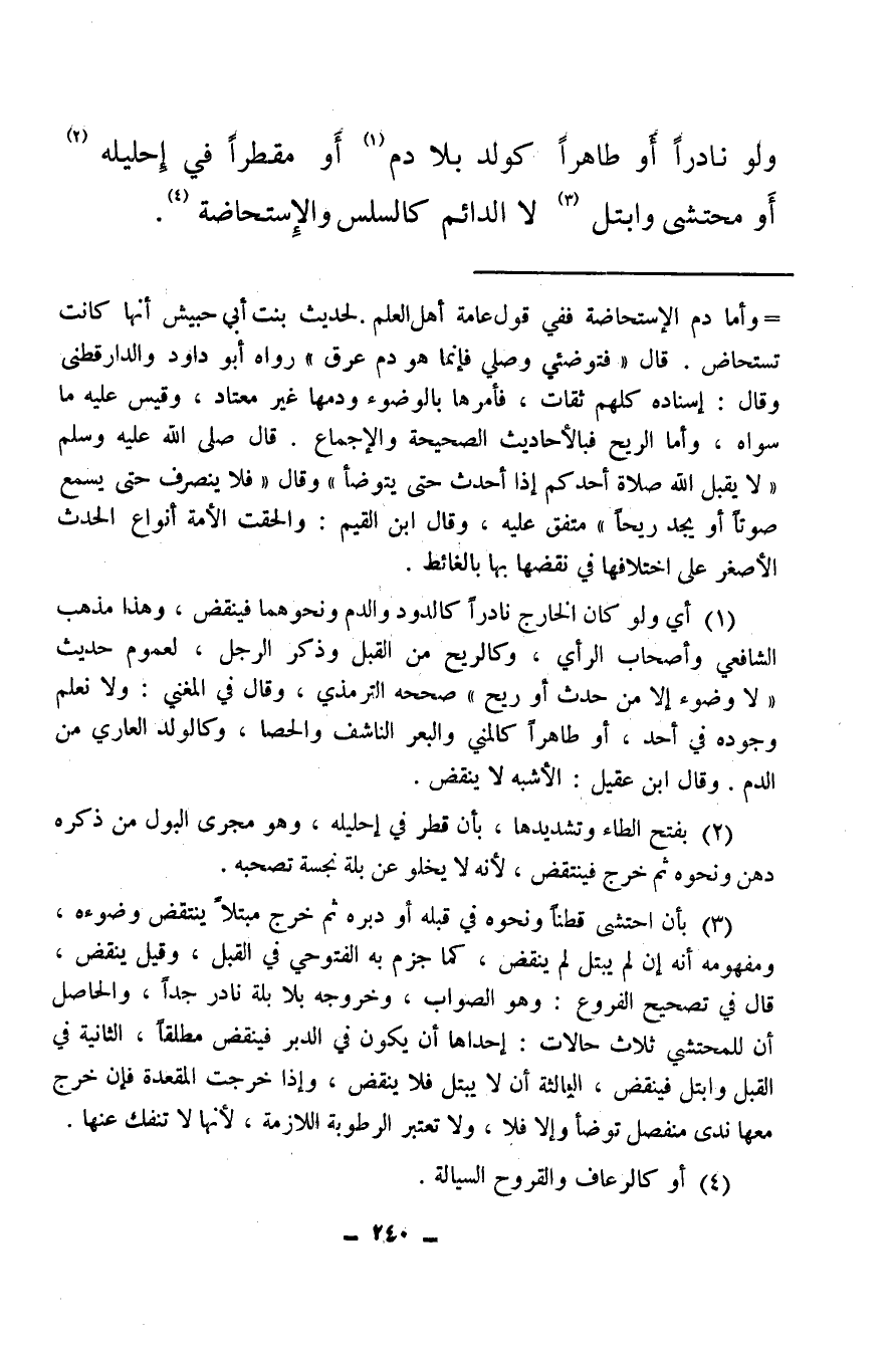 (¬3) بأن احتشى قطنا ونحوه في قبله أو دبره ثم خرج مبتلا ينتقض وضوءه، ومفهومه أنه إن لم يبتل لم ينقض، كما جزم به الفتوحي في القبل، وقيل ينقض، قال في تصحيح الفروع: وهو الصواب، وخروجه بلا بلة نادرة جدا، والحاصل أن للمحتشي ثلاث حالات: إحداها أن يكون في الدبر فينقض مطلقا، الثانية في القبل وابتل فينقض الثالثة: أن لا يبتل فلا ينقض، وإذا خرجت المقعدة فإن خرج معها ندى منفصل توضأ وإلا فلا، ولا تعتبر الرطوبة اللازمة، لأنها لا تنفك عنها.