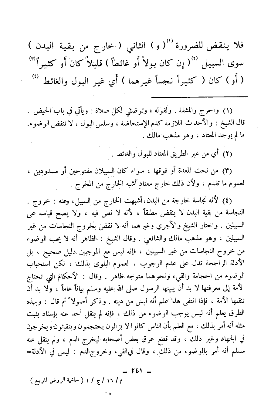 (¬4) لأنه نجاسة خارجة من البدن، أشبهت الخارج من السبيل وعنه: خروج: النجاسة من بقية البدن لا ينقض مطلقا، لأنه لا نص فيه، ولا يصح قياسه على السبيلين وهو مذهب مالك والشافعي.
