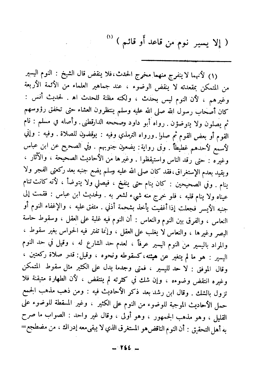 (¬1) لأنهما لا ينفرج منهما مخرج الحدث فلا ينقض قال الشيخ: النوم اليسير من المتمكن بمقعدته لا ينقض الوضوء، عند جماهير العلماء من الأئمة الأربعة وغيرهم، لأن النوم ليس بحدث، ولكنه مظنة للحدث اهـ، لحديث أنس: كان أصحاب رسول الله صلى الله عليه وسلم ينتظرون العشاء حتى تخفق رءوسهم ثم يصلون ولا يتوضئون رواه أبو داود وصححه الدارقطني، وأصله في مسلم: نام القوم أو بعض القوم ثم صلوا، ورواه الترمذي وفيه: يوقضون للصلاة، وفيه: وإني لأسمع لأحدهم غطيطا، وفي رواية يضعون جنوبهم، وفي الصحيح عن ابن عباس وغيره: حتى رقد الناس واستيقظوا وغيرها من الأحاديث الصحيحة، والآثار، ويقيد بعدم الاستغراق فقد كان صلى الله عليه وسلم يضع جنبه بعد ركعتي الفجر ولا ينام. وفي الصحيحين كان ينام حتى ينفخ فيصلي ولا يتوضأ، لأنه كانت تنام عيناه ولا ينام قلبه، فلو خرج منه شيء لشعر به، ولحديث ابن عباس: فقمت إلي جنبه الأيسر فجعلت إذا أغفيت يأخذ بشحمة أذني، متفق عليه، والإفاء النوم أو النعاس، والفرق بين النوم والنعاس: أن النوم فيه غلبة على العقل، وسقوط حاسة البصر وغيرها، والنعاس، لا يغلب على العقل، وإنما تفتر فيه الحواس بغير سقوط، والمراد باليسير من النوم اليسير عرفا، لعدم حد الشارع له، وقيل في حد النوم اليسير هو ما لم يتغير عن هيئته كسقوطه ونحوه، وقيل: قدر صلاة ركعتين، وقال الموفق: لا حد لليسير، فمتى وجد ما يدل على الكثير مثل سقوط المتمكن وغيره انتقض وضوءه، وإن شك في كثرته لم ينتقض لأن الطهارة متيقنة فلا تزول بالشك، وقال ابن رشد بعد ذكر الأحاديث فيه، ومن ذهب مذهب الجمع حمل الأحاديث الموجبة للوضوء من النوم على الكثير، وغير المسقطة للوضوء على القليل، وهو مذهب الجمهور، وهو أولى، وقال غير واحد: الصواب ما صرح به أهل التحقيق، أن النوم الناقض هو المستغرق الذي لا يبقى مع إدراك من مضجع أو مستلق لا على هيئة المصلي قال الزركشي وغيره: ولا بد في النوم الناقض من الغلبة على العقل، فمن سمع كلام غيره وفهمه فليس بنائم، ومن سمعه ولم يفهمه فيسير، إنما الناقض زوال العقل، فمتى كان ثابتا وحسه غير زائل لم يوجد سبب النقض، وعن أحمد: لا ينقض نوم مطلقا، واختار الشيخ إن ظن بقاء طهره.