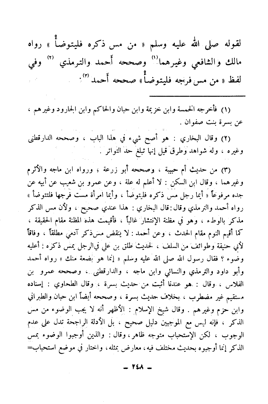(¬3) من حديث أم حبيبة، وصححه أبو زرعة، ورواه ابن ماجه والأثرم وغيرهما، وقال ابن السكن، لا أعلم له علة، وعن عمرو بن شعيب عن أبيه عن جده مرفوعا أيما رجل مس ذكره فليتوضأ، وأيما امرأة مست فرجها فلتتوضأ، رواه أحمد والترمذي وقال: قال البخاري: هذا عندي صحيح، ولأن مس الذكر مذكر بالوطء وهو في مظنة الانتشار غالبا، فأقيمت هذه المظنة مقام الحقيقة، كما أقيم النوم مقام الحدث، وعن أحمد: لا ينقض مس ذكر آدمي مطلقا، وفاقا لأبي حنيفة وطوائف من السلف، لحديث طلق بن علي في الرجل يمس ذكره: أعليه وضوء؟ فقال رسول الله صلى الله عليه وسلم إنما هو بضعة منك، رواه أحمد وأبو داود والترمذي والنسائي وابن ماجه، والدارقطني، وصححه عمرو بن الفلاس، وقال: هو عندنا أثبت من حديث بسرة، وقال الطحاوي، إسناده مستقيم غير مضطرب، بخلاف حديث بسرة، وصححه أيضا ابن حبان والطبراني وابن حزم وغيرهم.