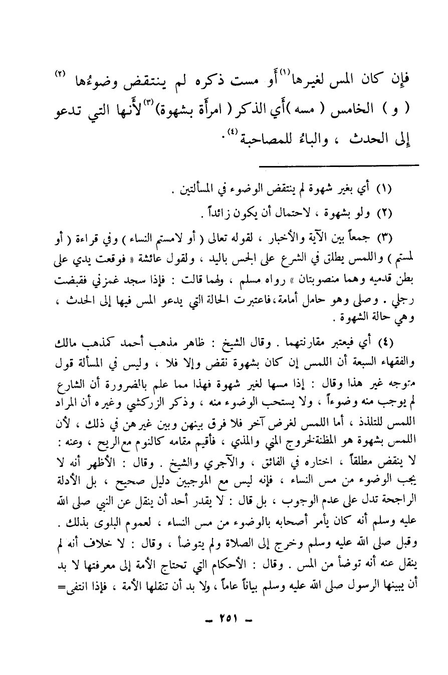 (¬3) جمعا ين الآية والأخبار لقوله تعالى: {أَوْ لامَسْتُمُ النِّسَاءَ} وفي قراءة (أو لمستم) واللمس يطلق في الشرع على الجس باليد، ولقول عائشة: فوقعت يدي على بطن قدميه وهما منصوبتان رواه مسلم، ولهما قالت: فإذا سجد غمزني فقبضت رجلي، وصلى وهو حامل أمامة فاعتبرت الحالة التي يدعو المس فيها إلى الحدث، هي حالة الشهوة.