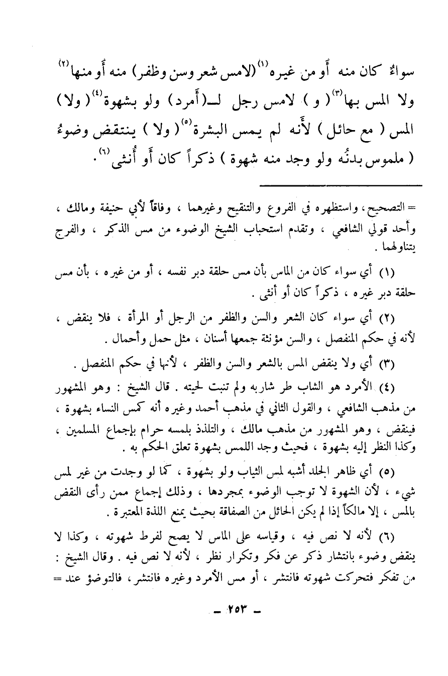 (¬4) الأمرد هو الشاب طر شاربه ولم تنبت لحيته، قال الشيخ: وهو المشهور من مذهب الشافعي، والقول الثاني في مذهب أحمد وغيره أنه كمس النساء بشهوة فينقض وهو المشهور من مذهب مالك، والتلذذ بلمسه حرام بإجماع المسلمين، وكذا النظر إليه بشهوة، فحيث وجد اللمس بشهوة تعلق الحكم به.
