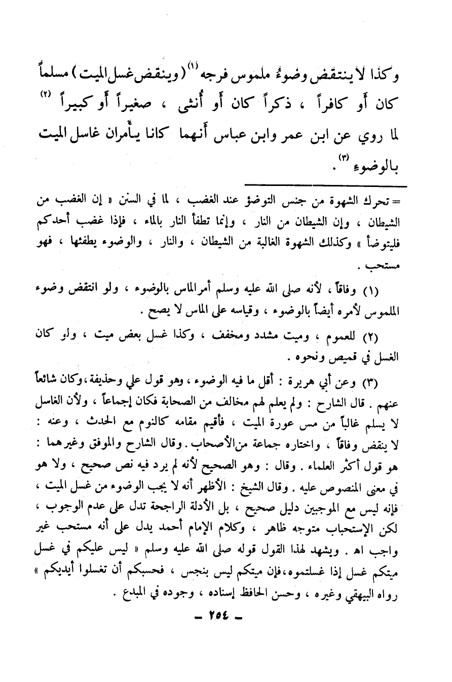 (¬3) وعن أبي هريرة، أقل ما فيه الوضوء، وهو قول علي وحذيفة، وكان شائعا عنهم، قال الشارح: ولم يعلم لهم مخالف من الصحابة فكان إجماعا، ولأن الغاسل لا يسلم غالبا من مس عورة الميت، فأقيم مقامه كالنوم مع الحدث، وعنه: لا ينقض وفاقا، واختاره جماعة من الأصحاب، وقال الشارح والموفق وغيرهما: هو قول أكثر العلماء، وقال: وهو الصحيح لأنه لم يرد فيه نص صحيح، ولا هو في معنى المنصوص عليه، وقال الشيخ: الأظهر أنه لا يجب الوضوء من غسل الميت، فإنه ليس مع الموجبين دليل صحيح، بل الأدلة الراجحة تدل على عدم الوجوب، لكن الاستحباب متوجه ظاهر، وكلام الإمام أحمد يدل على أنه مستحب غير واجب اهـ. ويشهد لهذا القول قوله صلى الله عليه وسلم ليس عليكم في غسل ميتكم غسل إذا غسلتموه فإن ميتكم ليس بنجس، فحسبكم أن تغسلوا أيديكم رواه البيهقي وغيره، وحسن الحافظ إسناده، وجوده في المبدع.