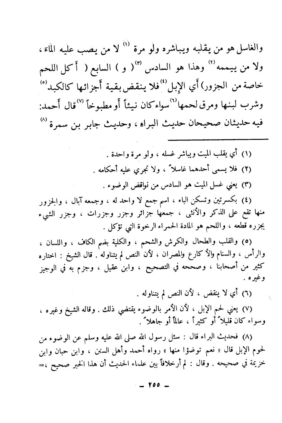 (¬8) فحديث البراء قال: سأل رسول الله صلى الله عليه وسلم عن الوضوء من لحوم الإبل قال: نعم توضئوا منها رواه أحمد وأهل السنن، وابن حبان وابن خزيمة في صحيحه، وقال: لم أر خلافا بين علماء الحديث أن هذا الخبر صحيح