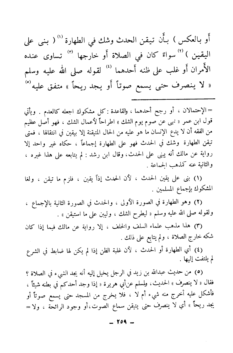 (¬5) من حديث عبد الله بن زيد في الرجل يخيل إليه أنه يجد الشيء في الصلاة؟ فقال: لا ينصرف الحديث ولمسلم عن أبي هريرة إذا وجد أحدكم في بطنه شيئا، فأشكل عليه أخرج منه شيء أم لا، فلا يخرج من المسجد حتى يسمع صوتا أو يجد ريحا، أي لا ينصرف حتى يتيقن سماع الصوت، أو وجود الرائحة ولا