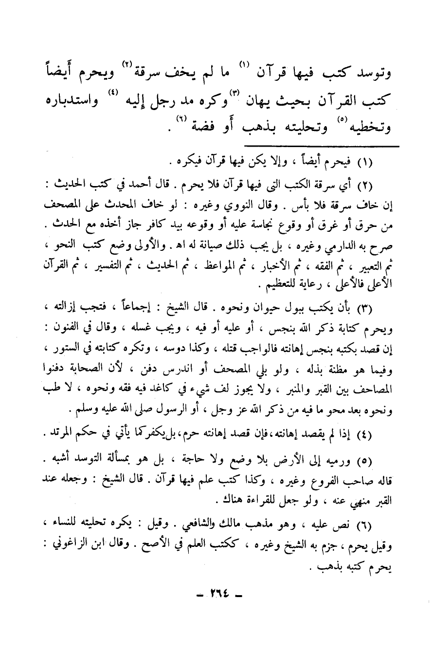(¬5) ورميه إلى الأرض بلا وضع ولا حاجة، بل هو بمسألة التوسد أشبه، قاله صاحب الفروع وغيره، وكذا كتب علم فيها قرآن، قال الشيخ: وجعله عند القبر منهي عنه، ولو جعل للقراءة هناك.