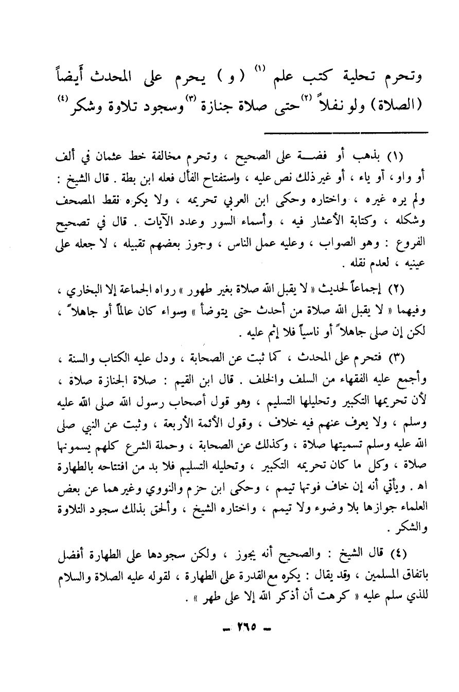 وتحرم تحلية كتب علم (¬1) (و) يحرم على المحدث أيضا (الصلاة) ولو نفلا (¬2) حتى صلاة جنازة (¬3) وسجود تلاوة وشكر (¬4) .