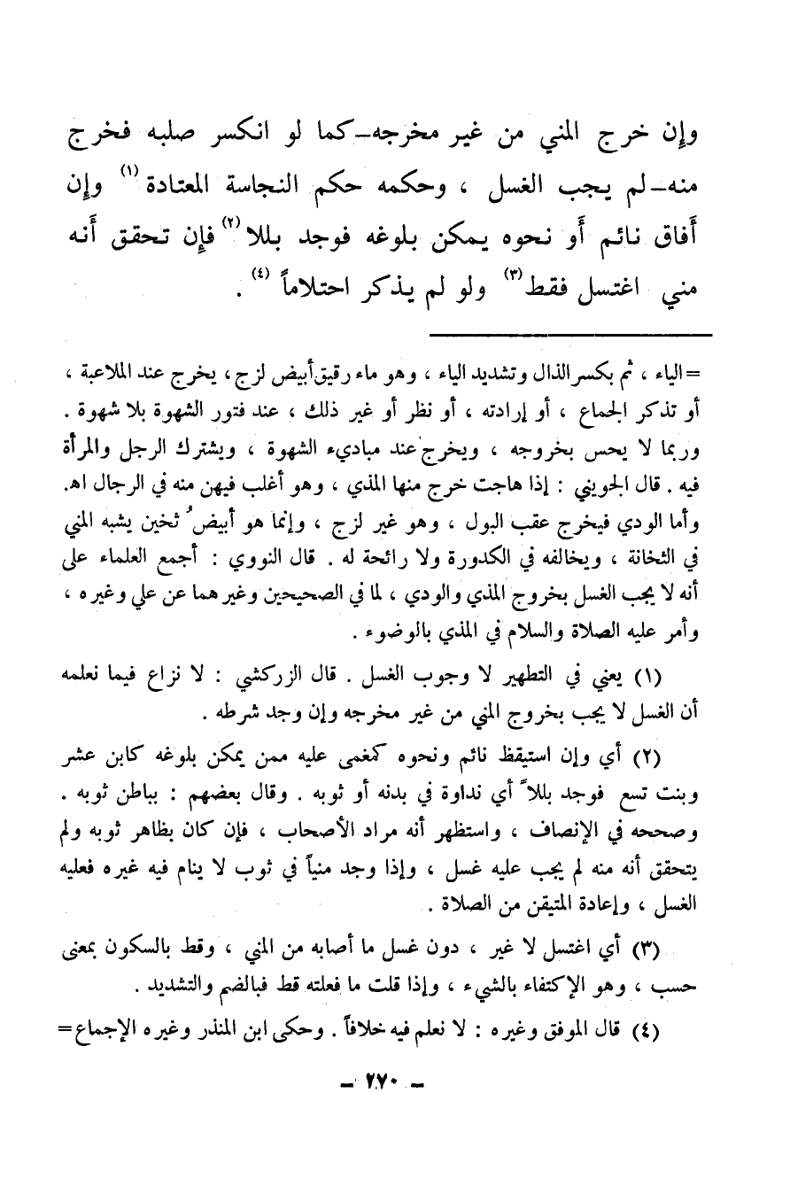 (¬1) يعني في التطهير لا وجوب الغسل، قال الزركشي، لا نزاع فيما نعلمه أن الغسل لا يجب بخروج المني من غير مخرجه وإن وجد شرطه.