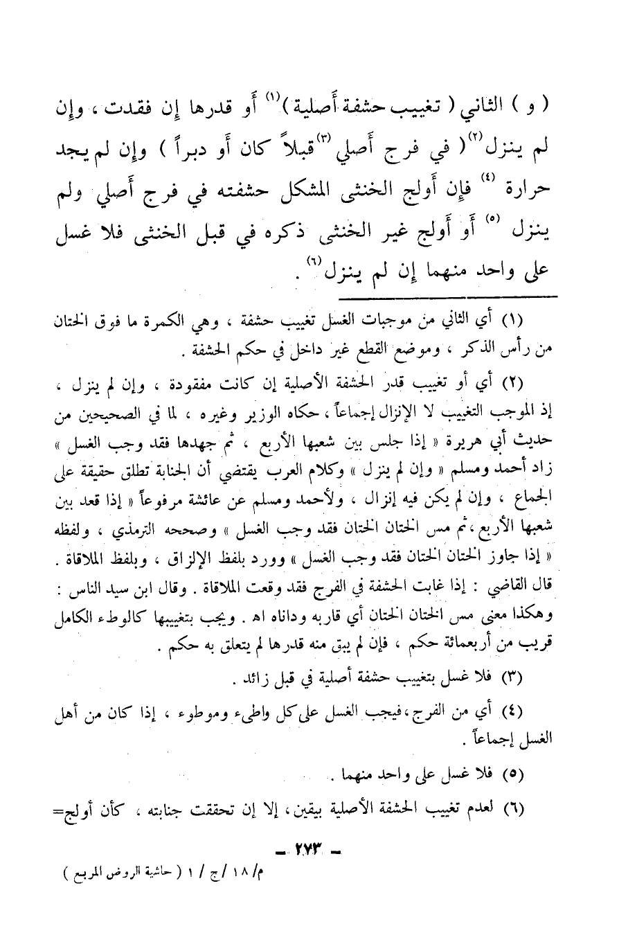 (و) الثاني (تغييب حشفة أصلية) (¬1) أو قدرها إن فقدت، وإن لم ينزل (¬2) (في فرج أصلي (¬3) قبلا كان أو دبرا) وإن لم يجد حرارة (¬4) فإن أولج الخنثى المشكل حشفته في فرج أصلي، ولم ينزل (¬5) أو أولج غير الخنثى ذكره في قبل الخنثى فلا غسل على واحد منهما إن لم ينزل (¬6) .