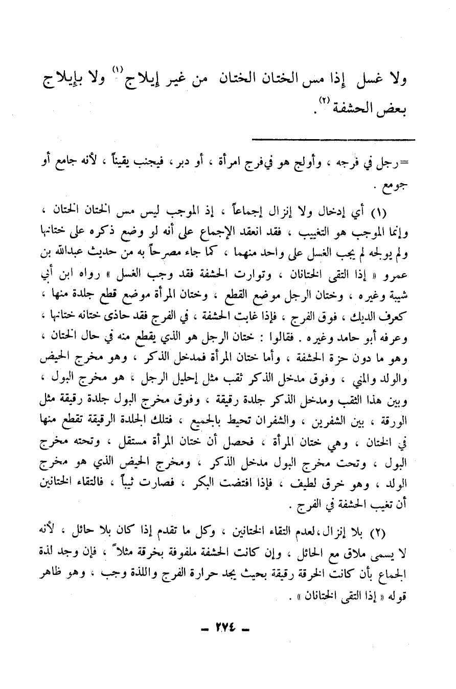 (¬1) أي إدخال ولا إنزال إجماعا، إذ الموجب ليس مس الختان الختان، وإنما الموجب هو التغييب، فقد انعقد الإجماع على أنه لو وضع ذكره على ختانها ولم يولجه لم يجب الغسل على واحد منهما، كما جاء مصرحا به من حديث عبد الله بن عمرو إذا التقى الختانان، وتوارت الحشفة فقد وجب الغسل، رواه ابن أبي شيبة وغيره، وختان الرجل موضع القطع، وختان المرأة موضع قطع جلدة منها، كعرف الديك، فوق الفرج فإذا غابت الحشفة في الفرج فقد حاذى ختانه ختانها، وعرفه أبو حامد وغيره، فقالوا: ختان الرجل هو الذي يقطع منه في حال الختان، وهو ما دون حزة الحشفة، وأما ختان المرأة فمدخل الذكر، وهو مخرج الحيض والولد والمني، وفوق مدخل الذكر ثقب مثل إحليل الرجل، هو مخرج البول، وبين هذا الثقب ومدخل الذكر جلدة رقيقة، وفوق مخرج البول جلدة رقيقة مثل الورقة، بين الشفرين، والشفران تحيط بالجميع، فتلك الجلدة الرقيقة تقطع منها في الختان، وهي ختان المرأة فحصل أن ختان المرأة مستقل، وتحته مخرج البول، وتحت مخرج البول مدخل الذكر، ومخرج الحيض الذي هو مخرج الولد، وهو خرق لطيف، فإذا افتضت البكر، فصارت ثيبا، فالتقاء الختانين أن تغيب الحشفة في الفرج.